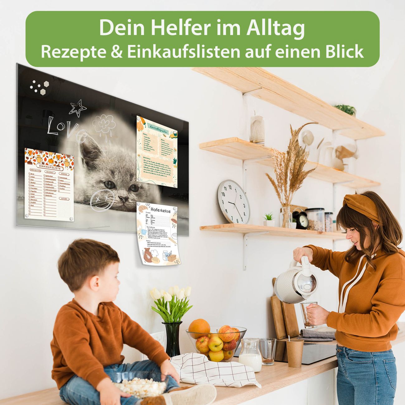 Auf der glatten Glasoberfläche lassen sich Termine, Rezepte oder Notizen ganz einfach mit Kreidestiften festhalten und rückstandslos entfernen. Starke Neodym-Magnete halten Ihre wichtigsten Erinnerungen sicher an Ort und Stelle. So entsteht Ihre ganz persönliche Ideenwand - jeden Tag neu.