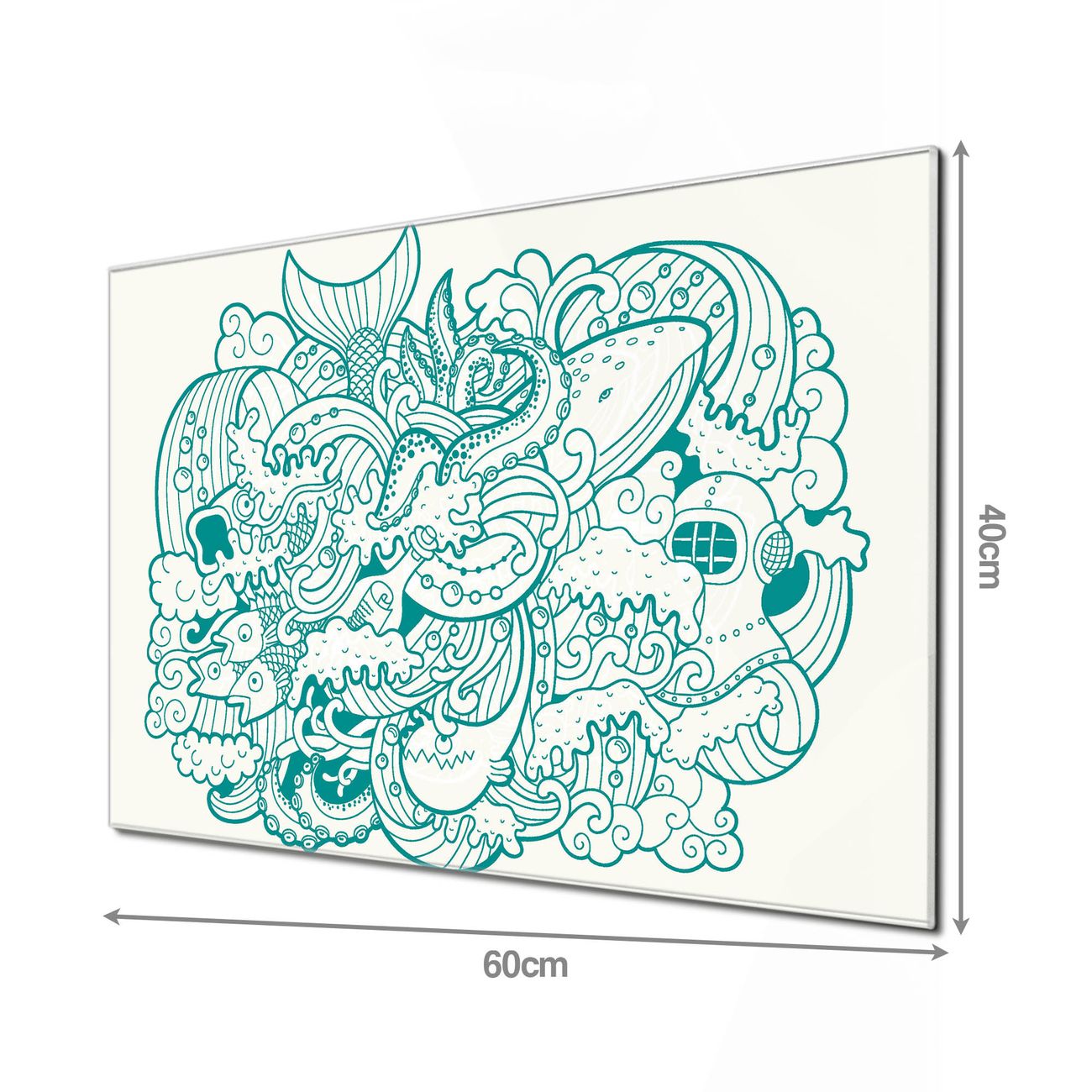 Material: 4mm Sicherheitsglas mit Metallrückwand Eigenschaften: beschreibbar, magnetisch, kratzfest Maße: 60x40x0,6cm, 3,6kg schwer Motiv Nummer 12577 Tiefsee Zubehör: inklusive 4 Neodym-Magnete