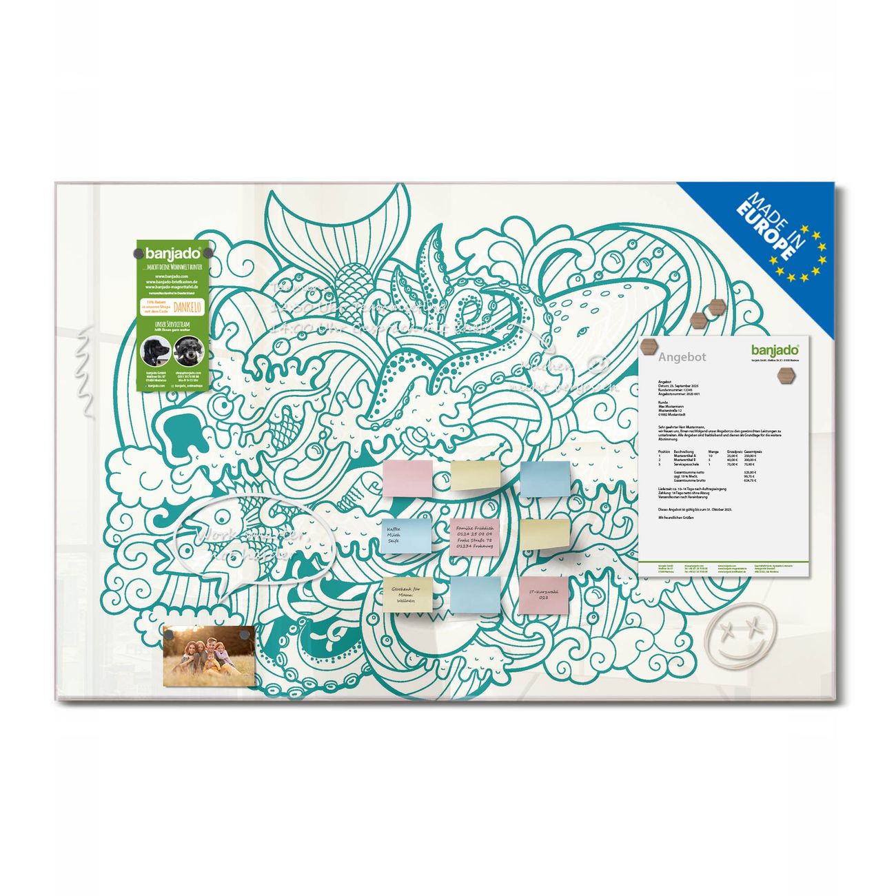 Jede Glas Magnettafel wird in unserer Werkstatt von Hand gefertigt und sorgfältig geprüft. So erhalten Sie ein echtes Qualitätsprodukt, das Funktion und Ästhetik perfekt vereint.?? Warum banjado?