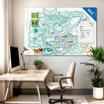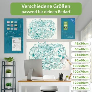Material: 4mm Sicherheitsglas mit Metallrückwand Eigenschaften: beschreibbar, magnetisch, kratzfest Maße: 90x60x0,6cm, 8,10kg schwer Motiv Nummer 12577 Tiefsee Zubehör: inklusive 4 Neodym-Magnete