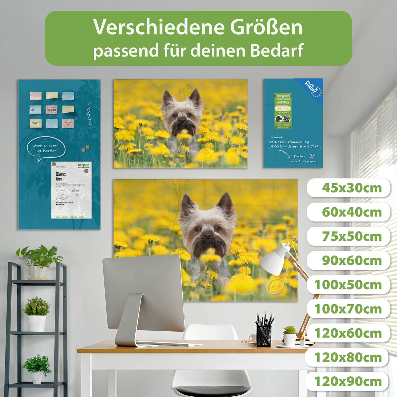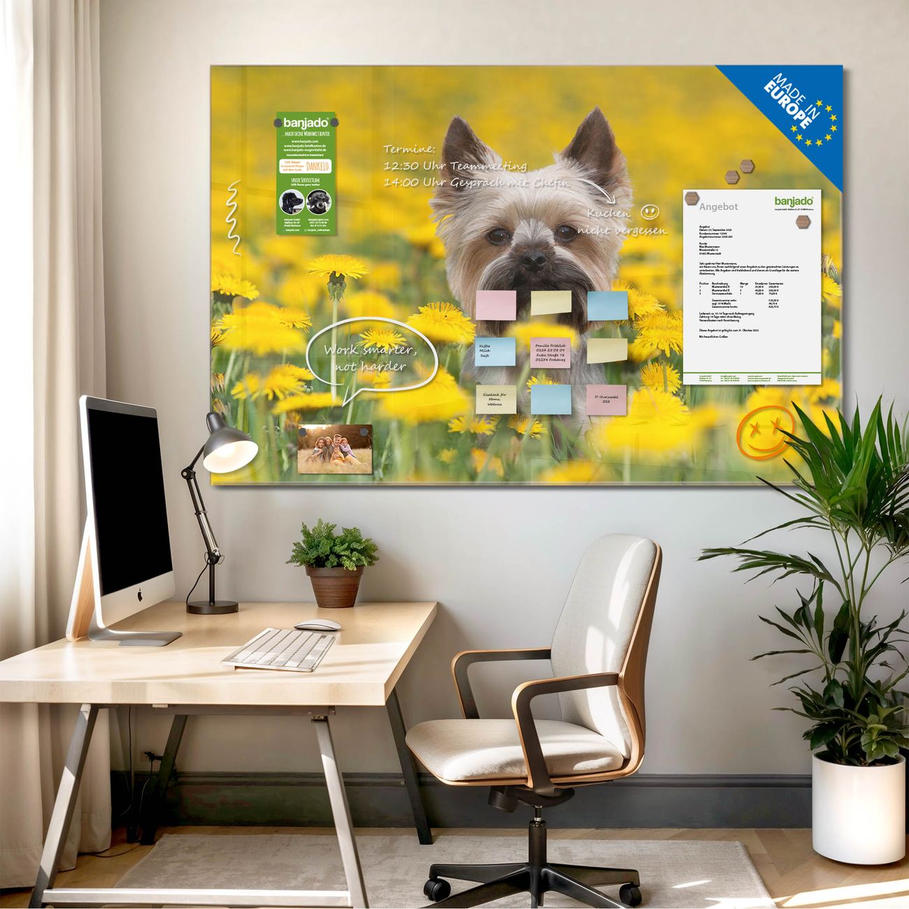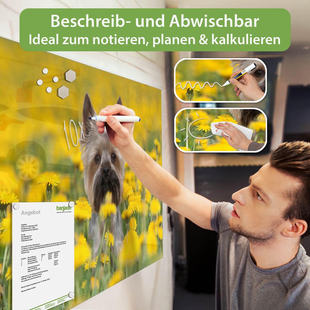 Jede Glas Magnettafel wird in unserer Werkstatt von Hand gefertigt und sorgfältig geprüft. So erhalten Sie ein echtes Qualitätsprodukt, das Funktion und Ästhetik perfekt vereint.?? Warum banjado?