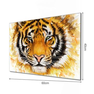 Material: 4mm Sicherheitsglas mit Metallrückwand Eigenschaften: beschreibbar, magnetisch, kratzfest Maße: 60x40x0,6cm, 3,6kg schwer Motiv Nummer 12328 Tigerkopf Zubehör: inklusive 4 Neodym-Magnete