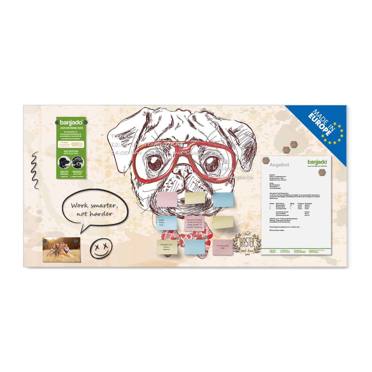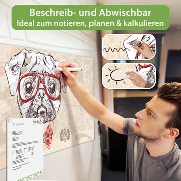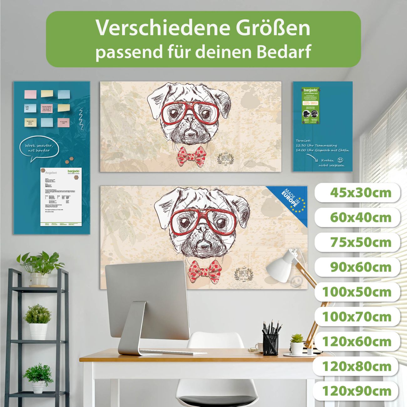 Material: 4mm Sicherheitsglas mit Metallrückwand Eigenschaften: beschreibbar, magnetisch, kratzfest Maße: 100x50x0,6cm, 7,50kg schwer Motiv Nummer 12395 Timothy Zubehör: inklusive 4 Neodym-Magnete