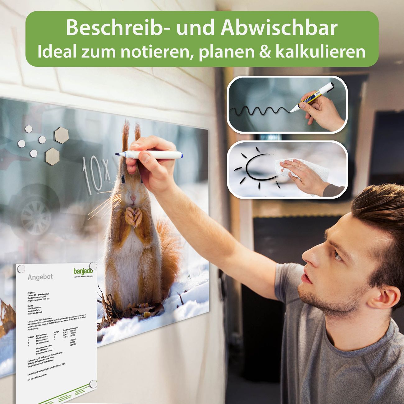 Bitte beachten Sie, dass ausschliessliche spezielle Magnete an der Glastafel haften. Wir empfehlen banjado Neodym Magnete, diese sind durch uns auf Wirksamkeit geprüft.