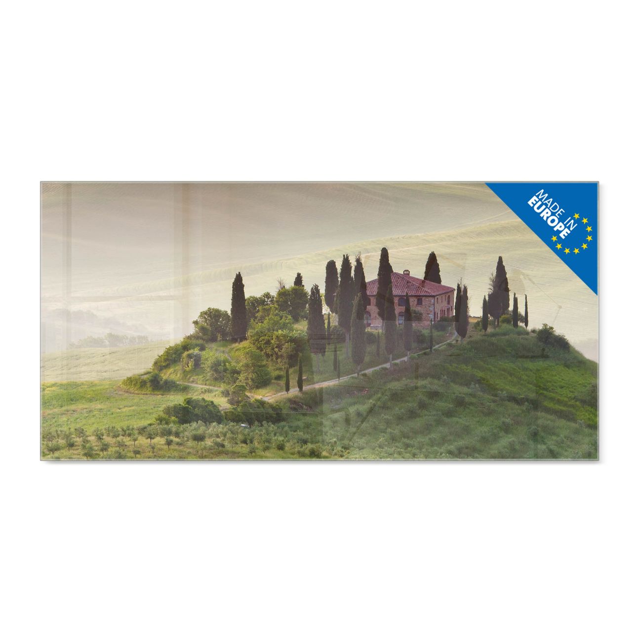 Material: 4mm Sicherheitsglas mit Metallrückwand Eigenschaften: beschreibbar, magnetisch, kratzfest Maße: 120x60x0,6cm, 10,80kg schwer Motiv Nummer 10433 Toscana Zubehör: inklusive 4 Neodym-Magnete