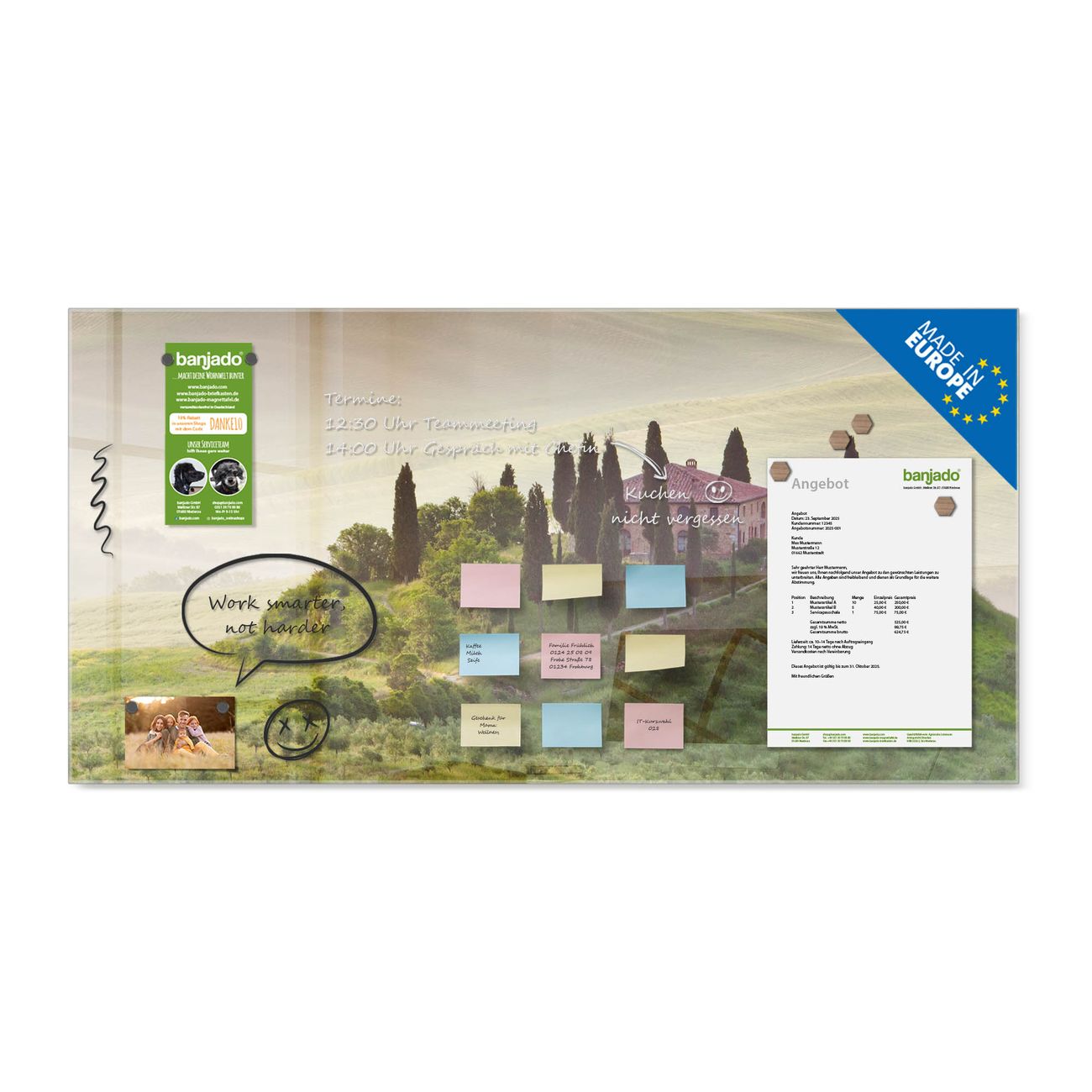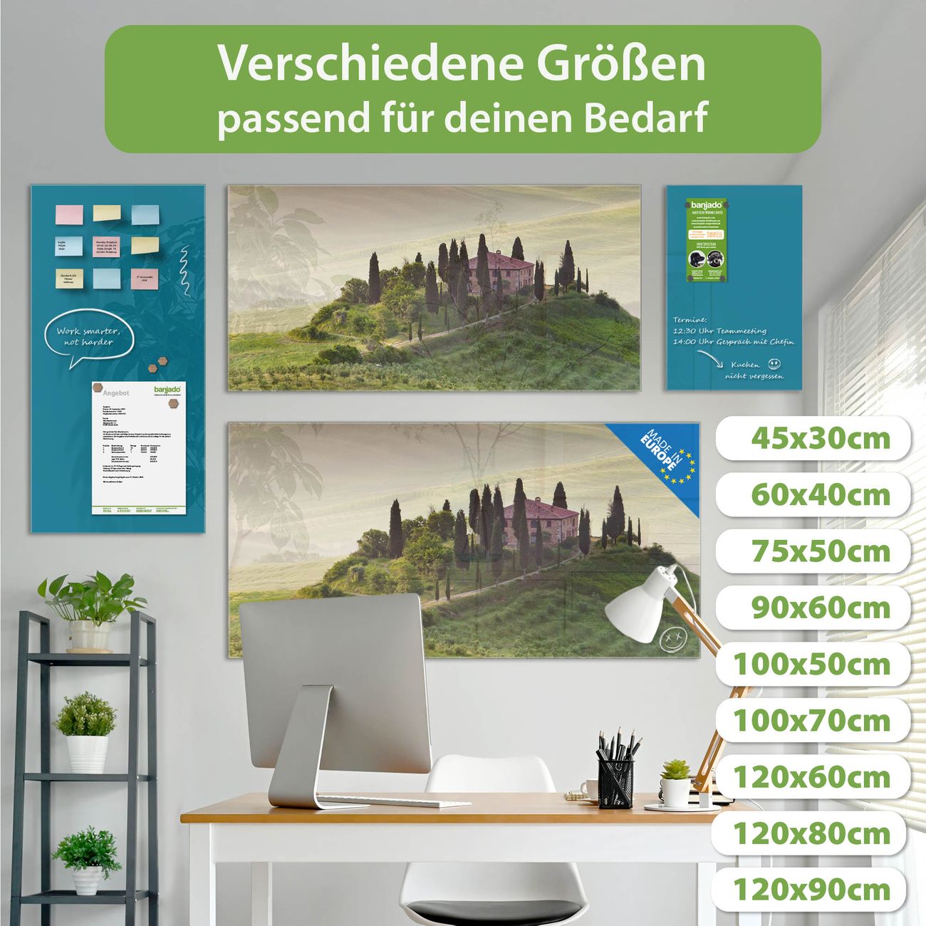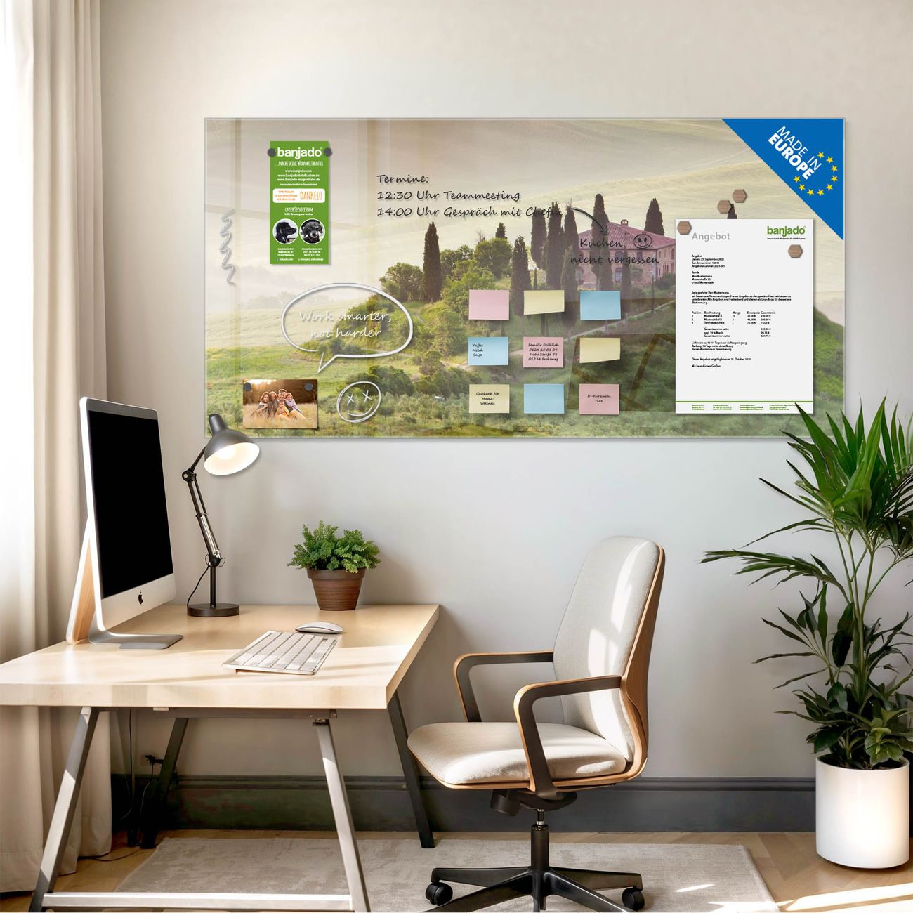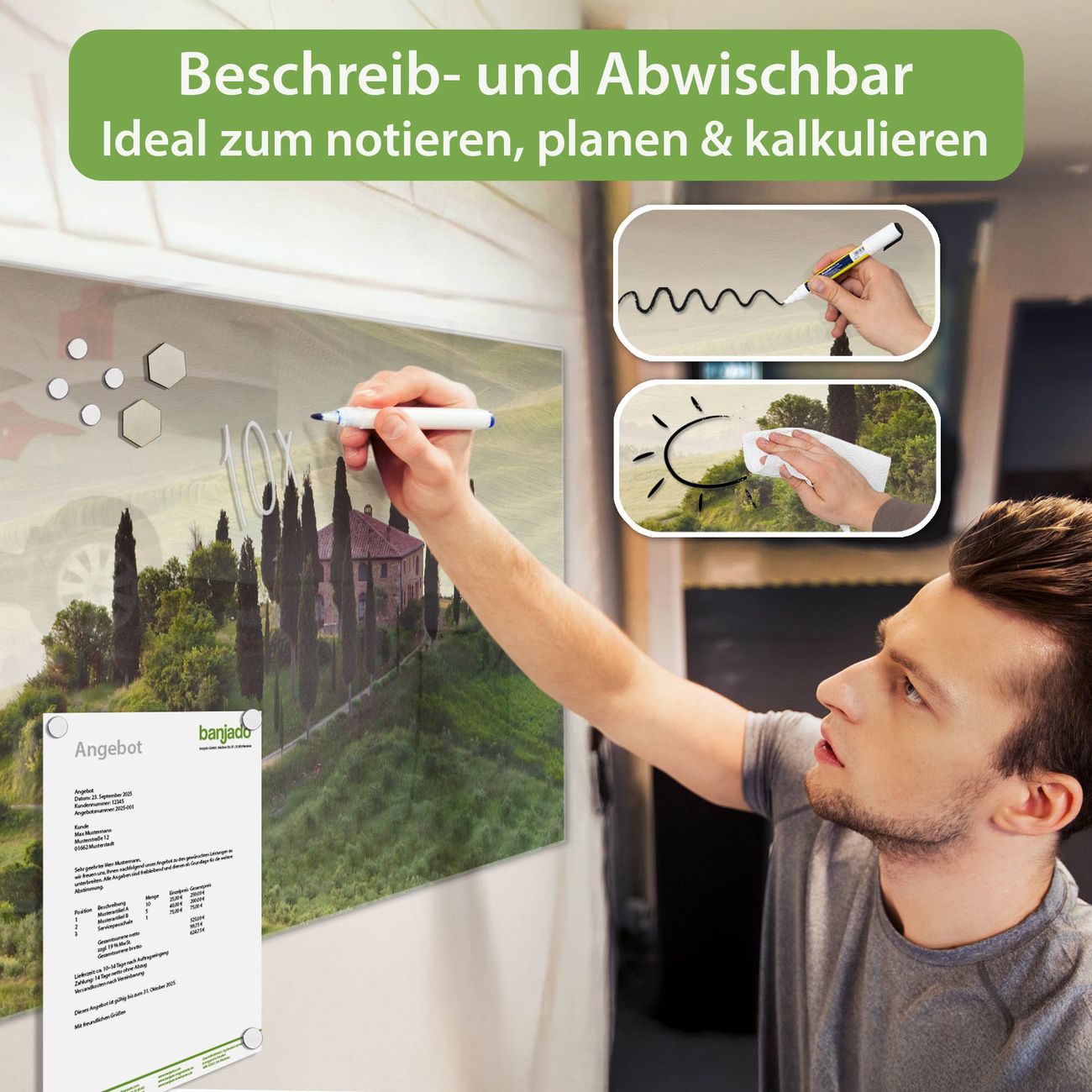Jede Glas Magnettafel wird in unserer Werkstatt von Hand gefertigt und sorgfältig geprüft. So erhalten Sie ein echtes Qualitätsprodukt, das Funktion und Ästhetik perfekt vereint.?? Warum banjado?