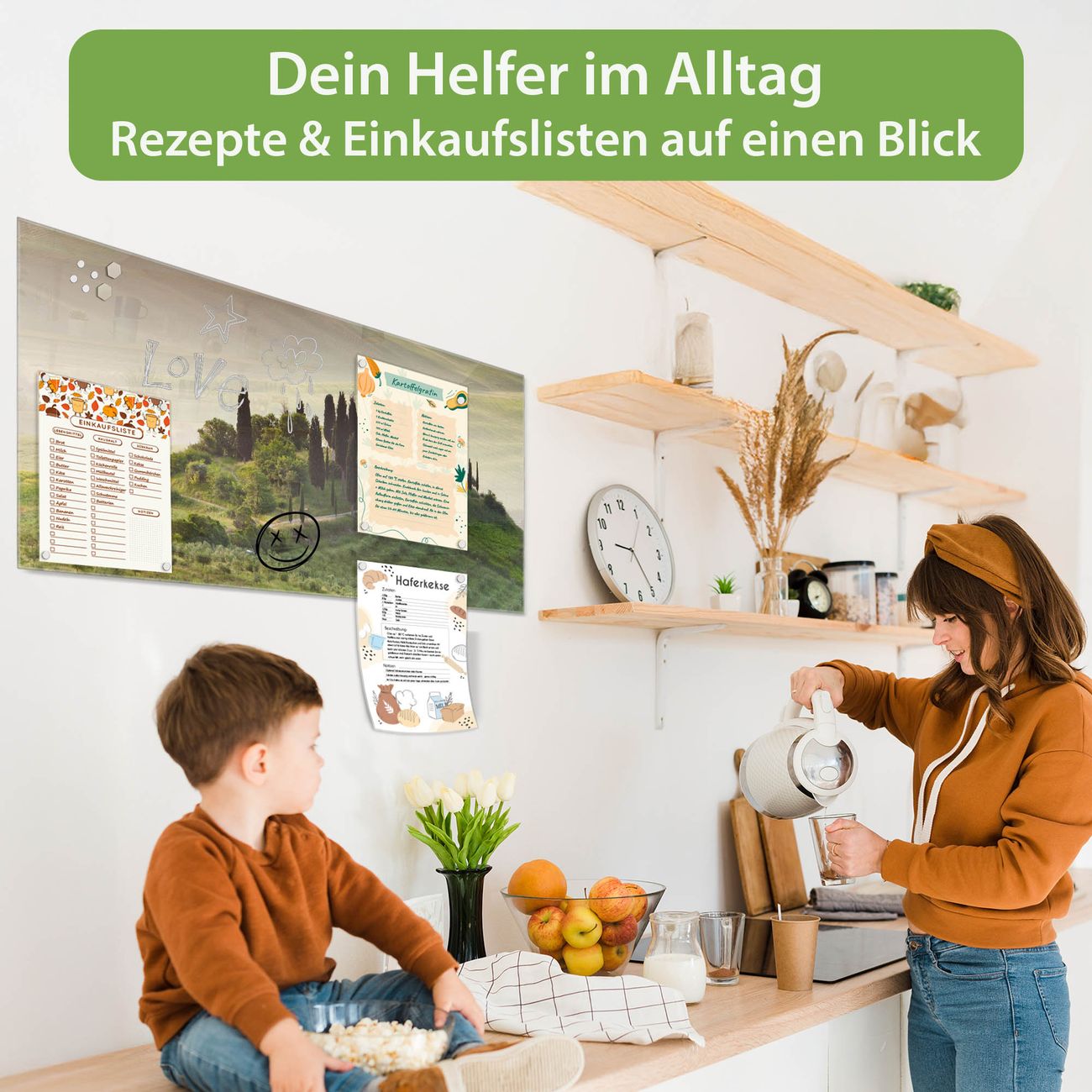 Auf der glatten Glasoberfläche lassen sich Termine, Rezepte oder Notizen ganz einfach mit Kreidestiften festhalten und rückstandslos entfernen. Starke Neodym-Magnete halten Ihre wichtigsten Erinnerungen sicher an Ort und Stelle. So entsteht Ihre ganz persönliche Ideenwand - jeden Tag neu.
