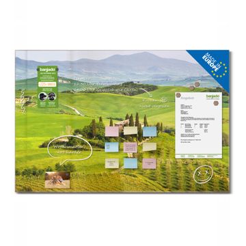Material: 4mm Sicherheitsglas mit Metallrückwand Eigenschaften: beschreibbar, magnetisch, kratzfest Maße: 120x80x0,6cm, 14,40kg schwer Motiv Nummer 12316 Toskana Zubehör: inklusive 4 Neodym-Magnete