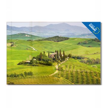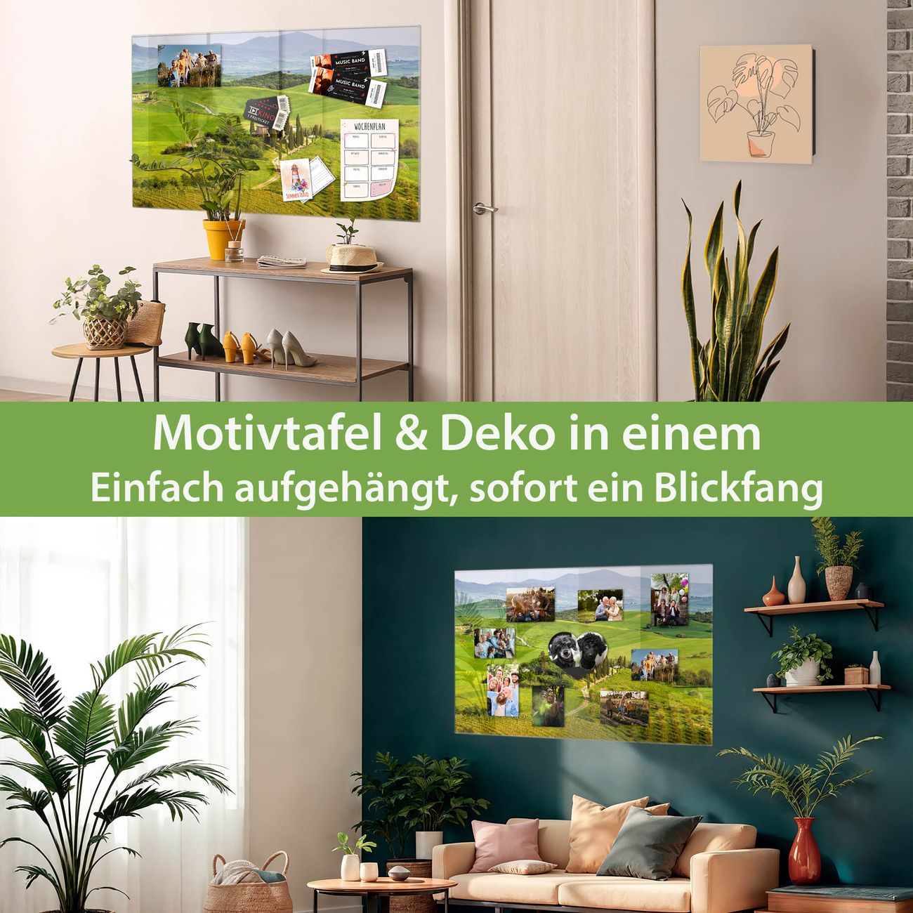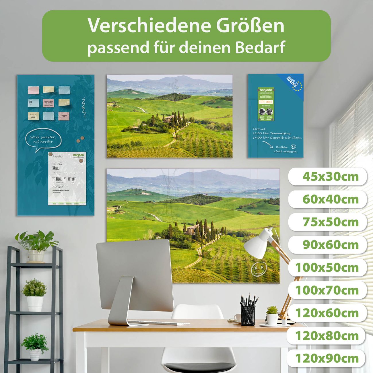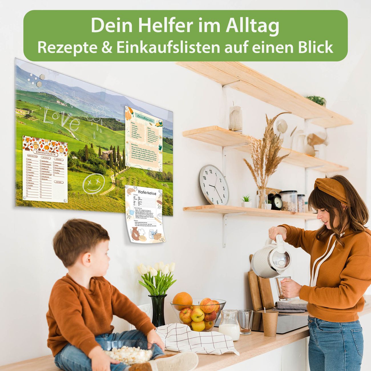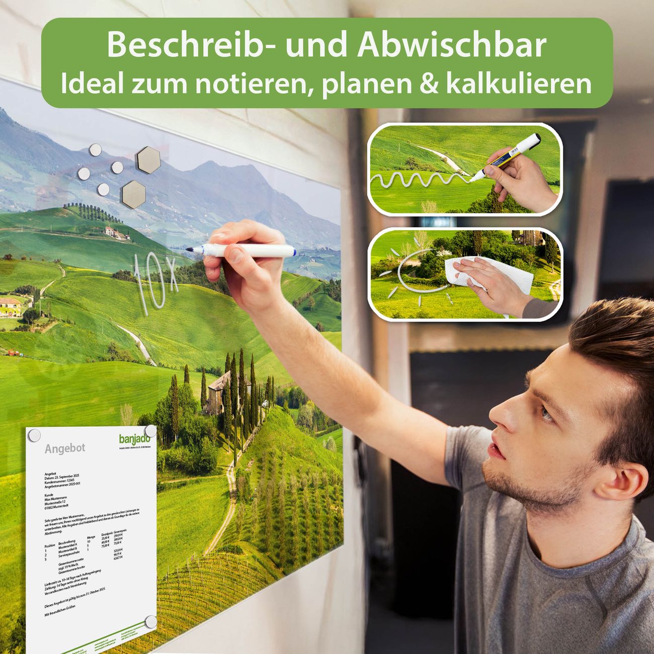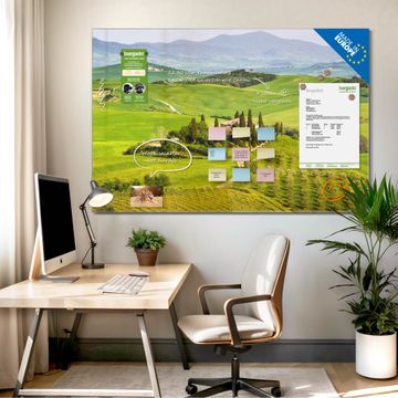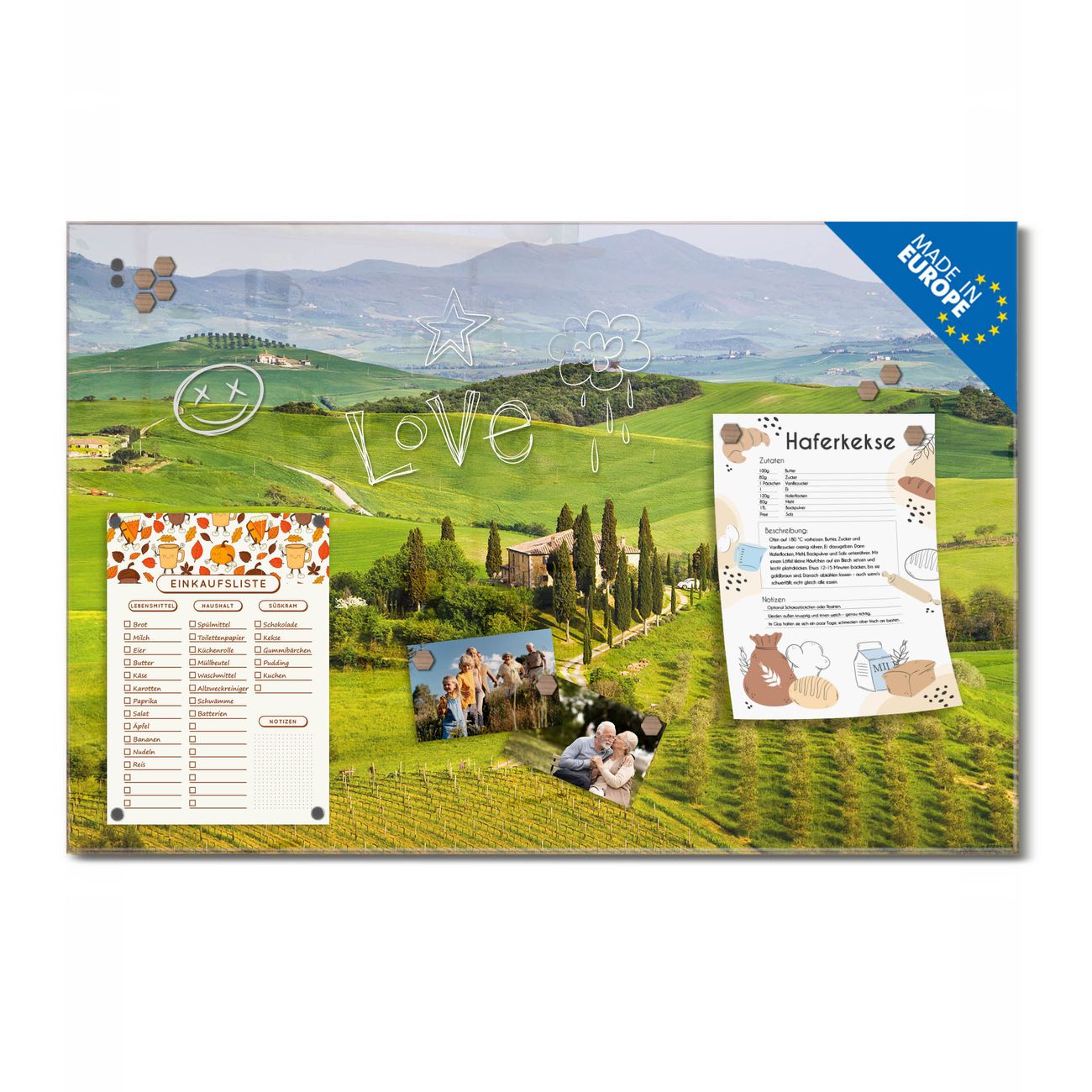 Material: 4mm Sicherheitsglas mit Metallrückwand Eigenschaften: beschreibbar, magnetisch, kratzfest Maße: 75x50x0,6cm, 5,63kg schwer Motiv Nummer 12316 Toskana Zubehör: inklusive 4 Neodym-Magnete