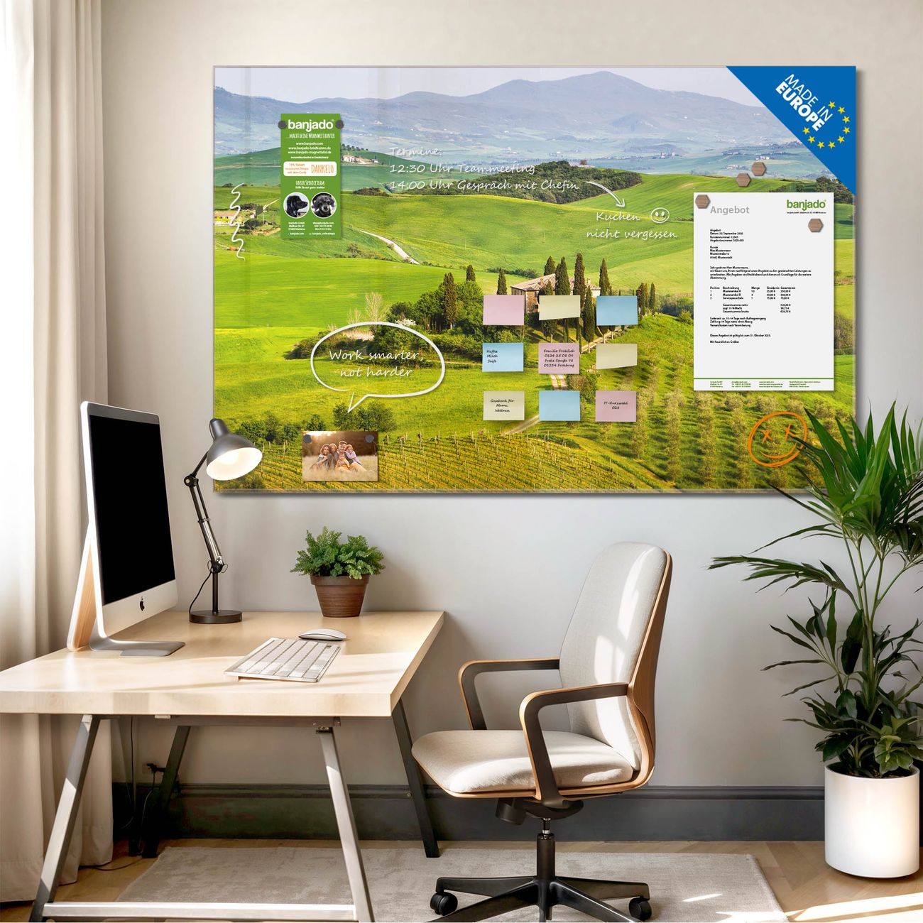 Die banjado Glas Magnettafel mit dem Motiv Motiv Toskana verbindet Funktionalität mit Stil. Sie ersetzt das Zettelchaos durch klare Strukturen und bringt dabei eine warme, natürliche Atmosphäre in Ihr Zuhause. Ob im Büro, in der Küche oder im Eingangsbereich - dieses Design-Board zieht Blicke an und sorgt für Ordnung mit Charakter.