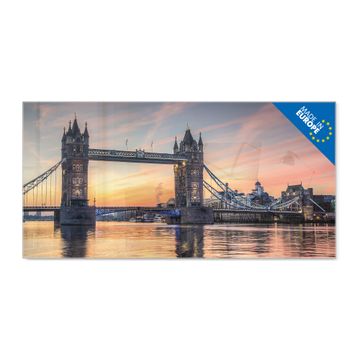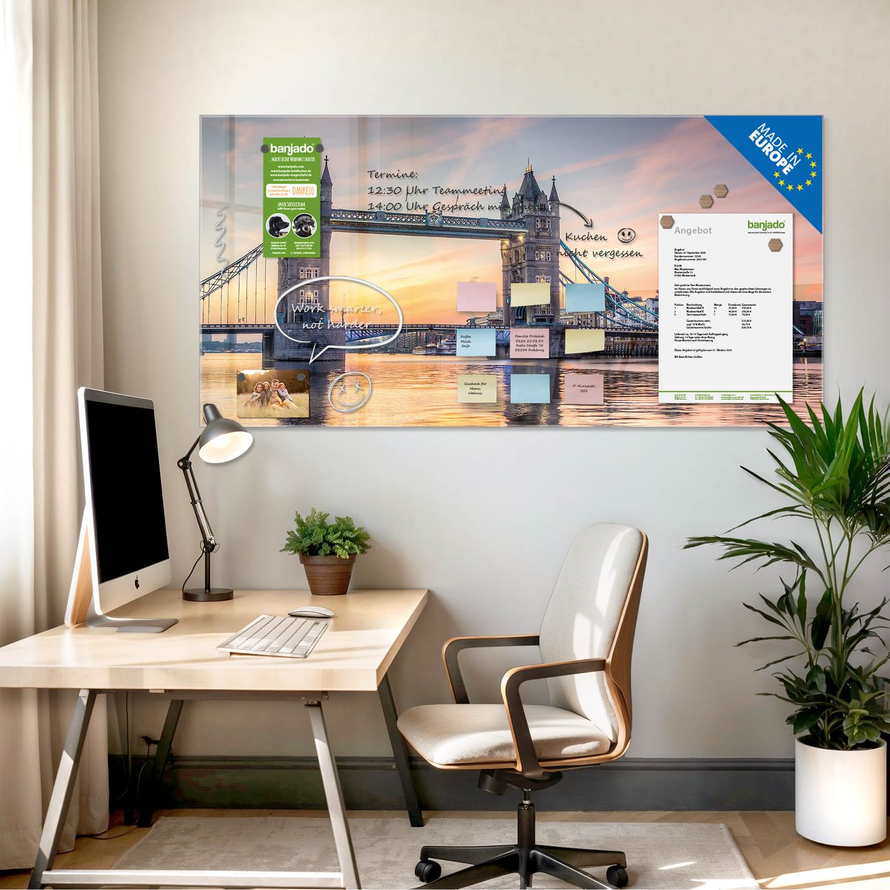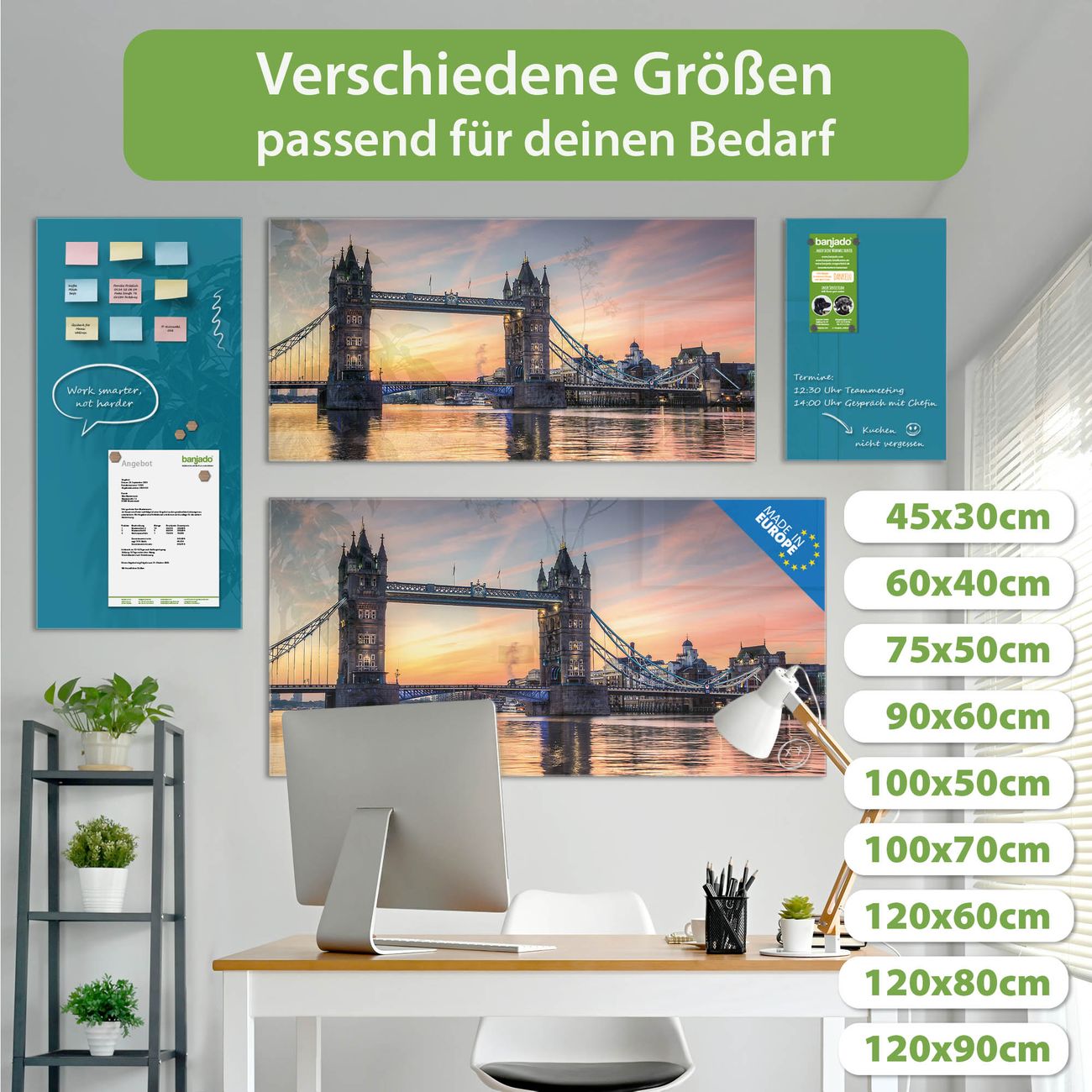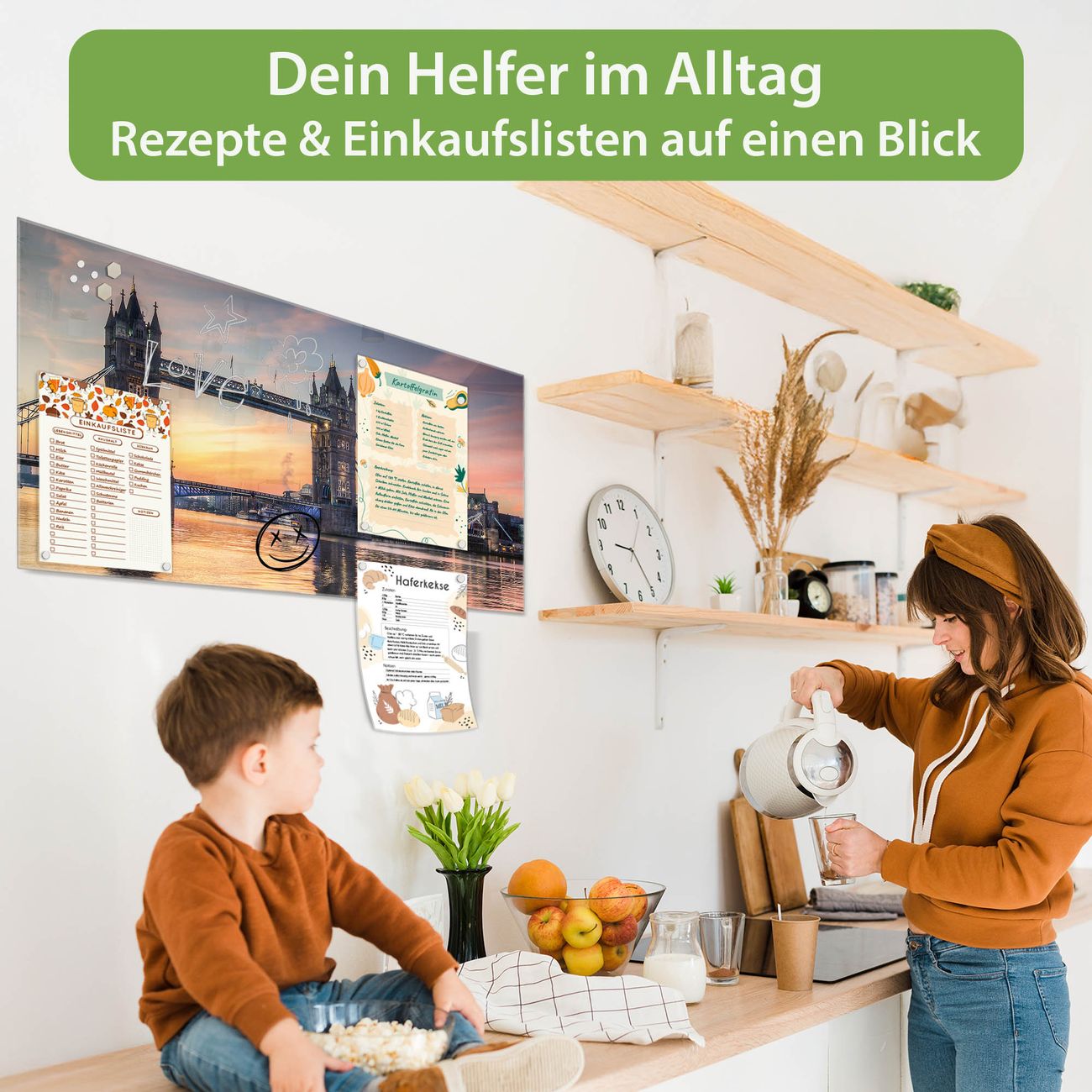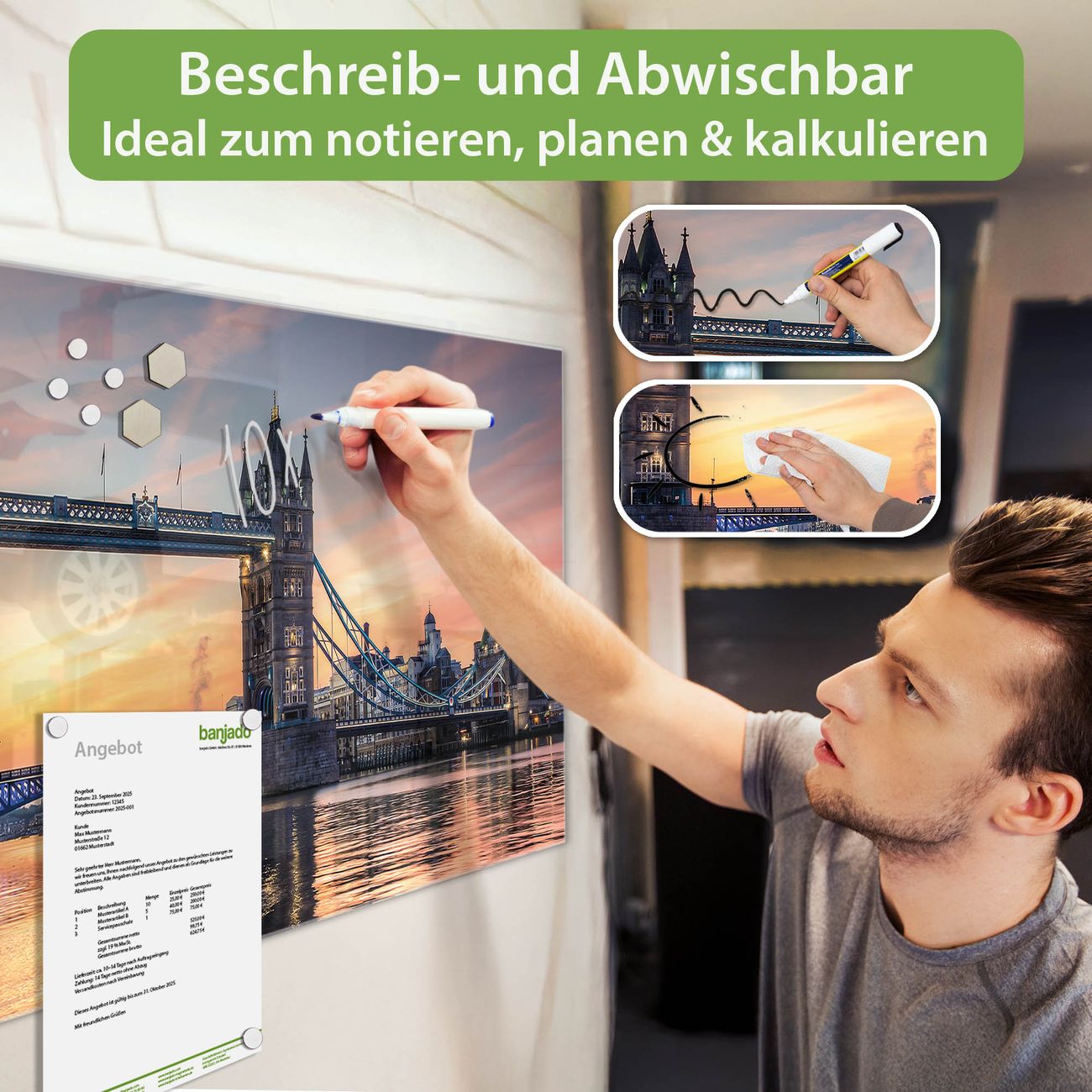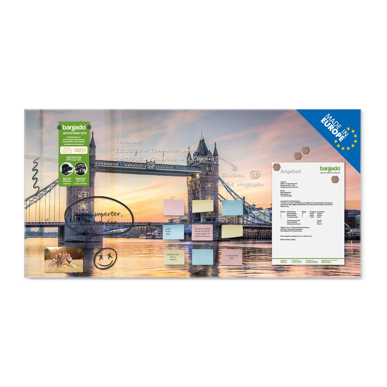 Material: 4mm Sicherheitsglas mit Metallrückwand Eigenschaften: beschreibbar, magnetisch, kratzfest Maße: 100x50x0,6cm, 7,50kg schwer Motiv Nummer 12412 Tower Bridge Zubehör: inklusive 4 Neodym-Magnete
