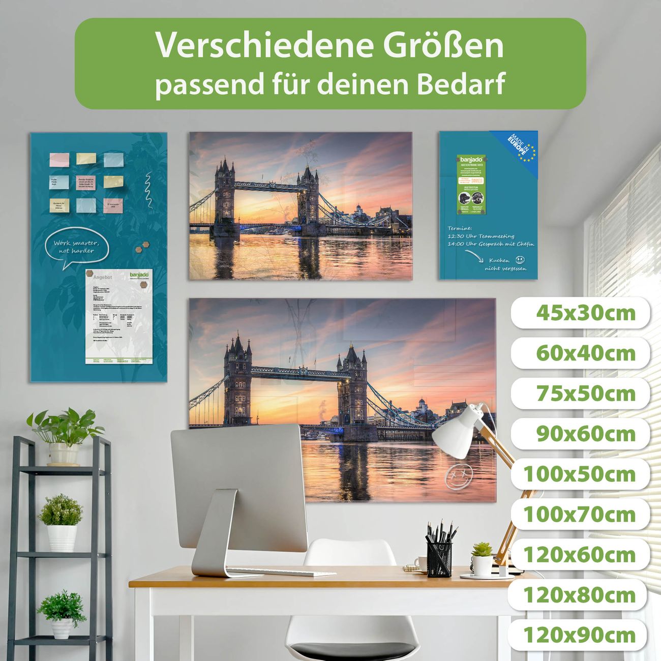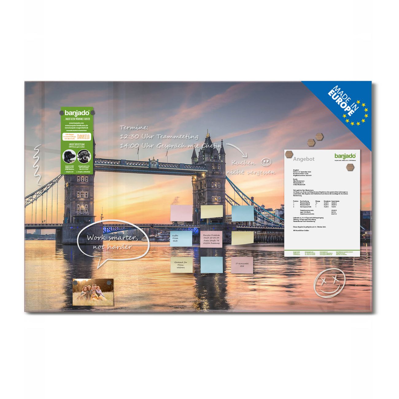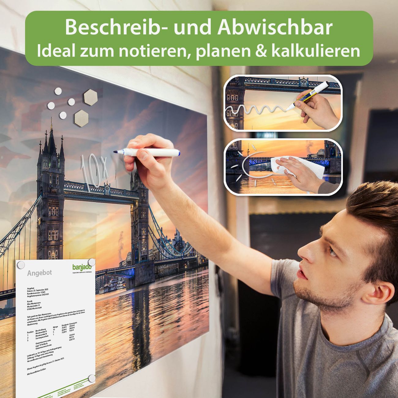 Jede Glas Magnettafel wird in unserer Werkstatt von Hand gefertigt und sorgfältig geprüft. So erhalten Sie ein echtes Qualitätsprodukt, das Funktion und Ästhetik perfekt vereint.?? Warum banjado?