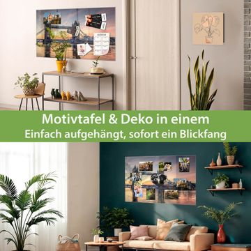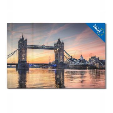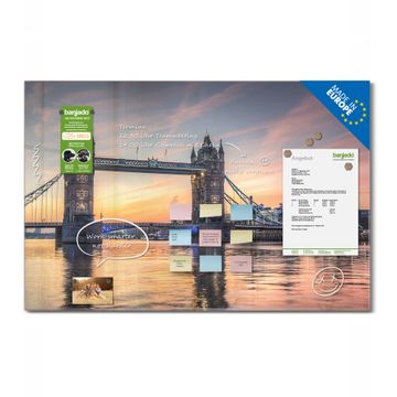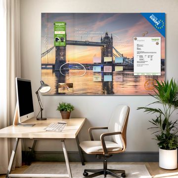 Material: 4mm Sicherheitsglas mit Metallrückwand Eigenschaften: beschreibbar, magnetisch, kratzfest Maße: 120x80x0,6cm, 14,40kg schwer Motiv Nummer 12412 Tower Bridge Zubehör: inklusive 4 Neodym-Magnete