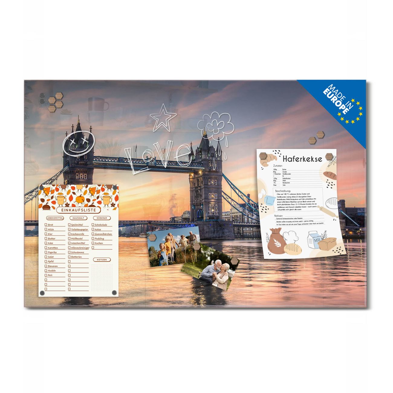 Material: 4mm Sicherheitsglas mit Metallrückwand Eigenschaften: beschreibbar, magnetisch, kratzfest Maße: 75x50x0,6cm, 5,63kg schwer Motiv Nummer 12412 Tower Bridge Zubehör: inklusive 4 Neodym-Magnete