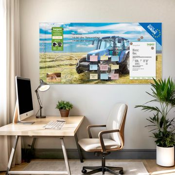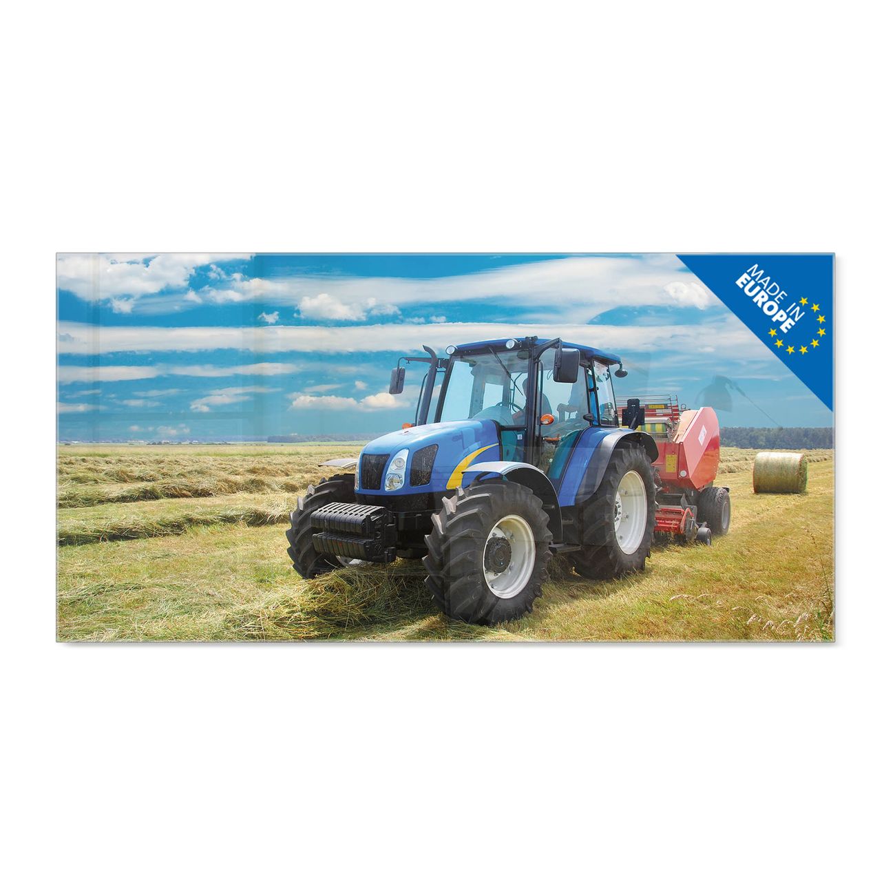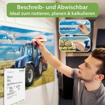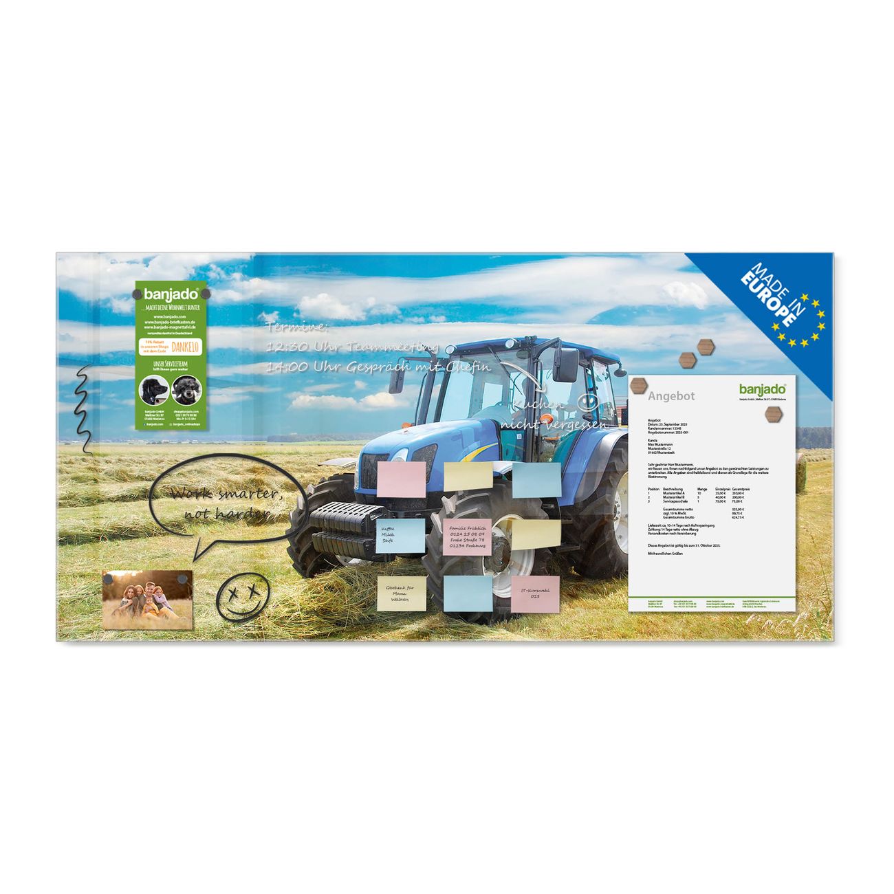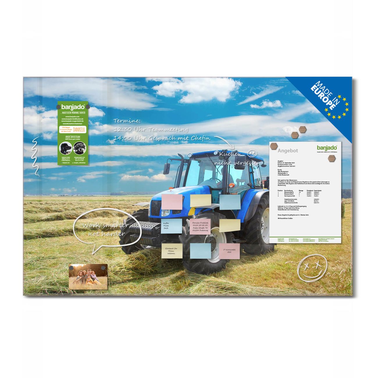 Material: 4mm Sicherheitsglas mit Metallrückwand Eigenschaften: beschreibbar, magnetisch, kratzfest Maße: 120x80x0,6cm, 14,40kg schwer Motiv Nummer 10128 Traktor Zubehör: inklusive 4 Neodym-Magnete