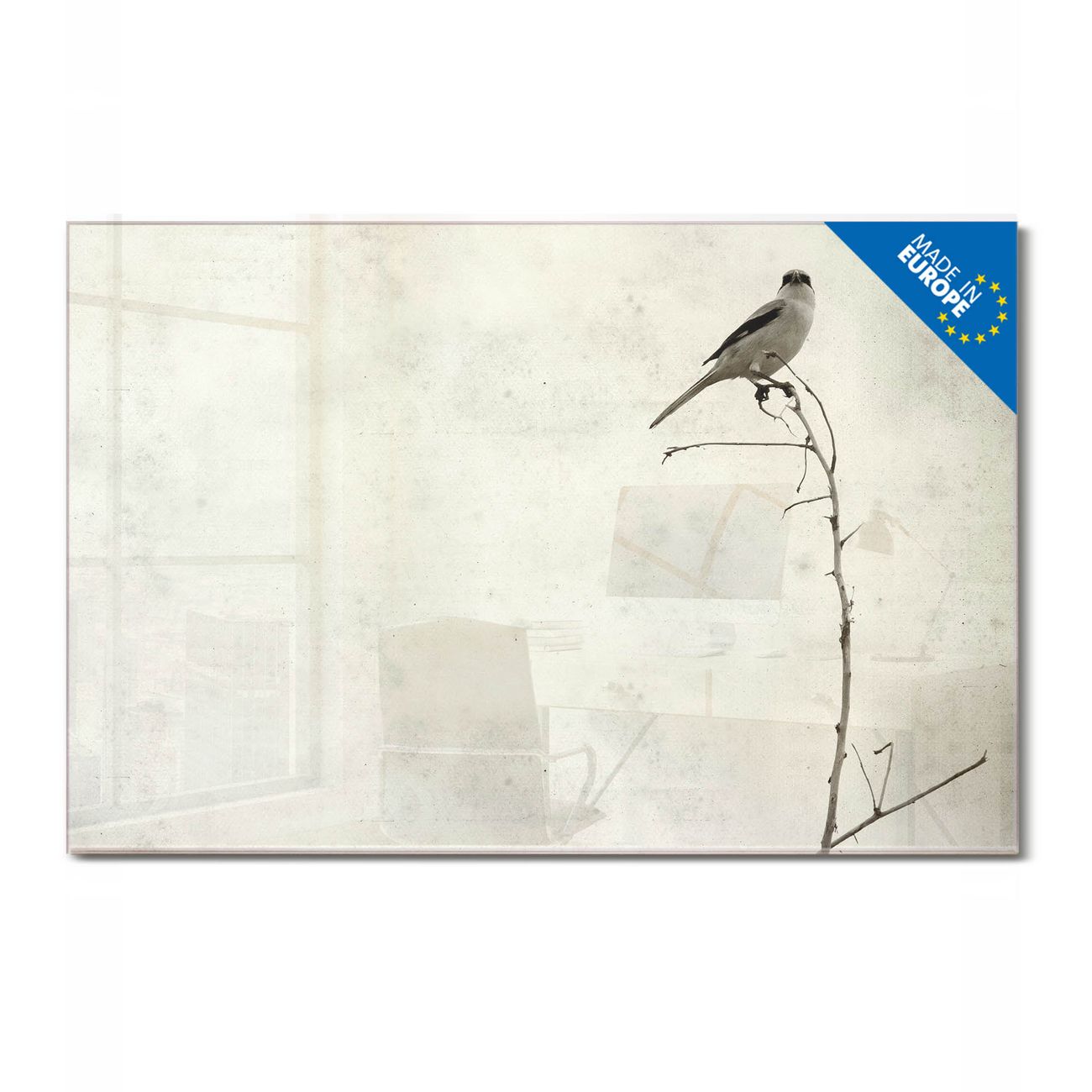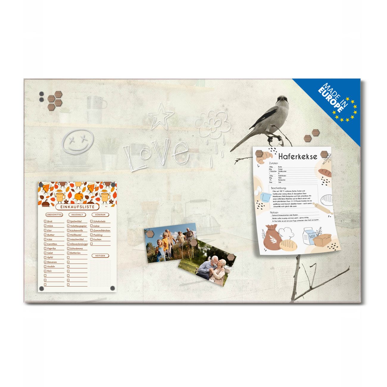Material: 4mm Sicherheitsglas mit Metallrückwand Eigenschaften: beschreibbar, magnetisch, kratzfest Maße: 45x30x0,6cm, 2,03kg schwer Motiv Nummer 11476 Tristessa Zubehör: inklusive 4 Neodym-Magnete