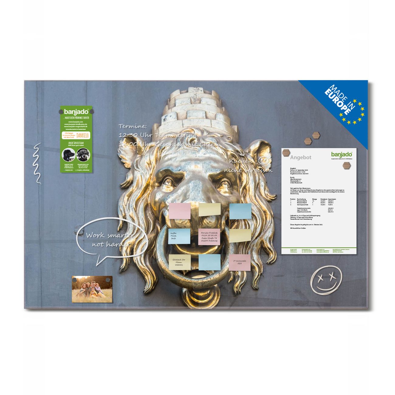 Ein Stück Design, das Ihren Alltag organisiert. Schreiben, heften, inspirieren - alles an einem Ort. Qualität, die man spürt. Montage leicht gemacht. Handwerk mit Herz - veredelt in Sachsen. Einzigartiges Design mit Motiv Motiv Türklopfer Löwe Beschreibbare Glasoberfläche, leicht zu reinigen Starke Magnetkraft durch Stahlrückwand Inklusive 4 Neodym-Magneten Flexible Montageoptionen Handveredelt in Sachsen - Qualität, die bleibt