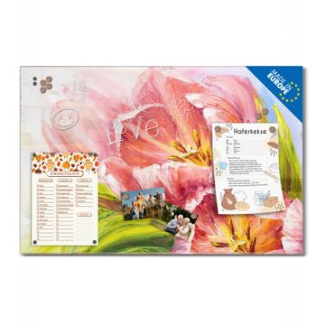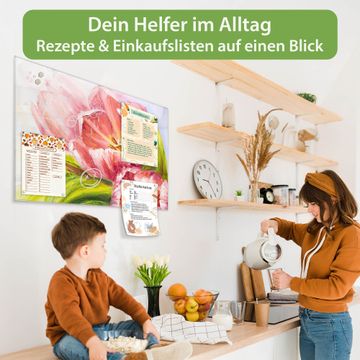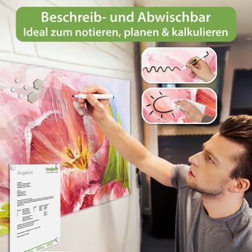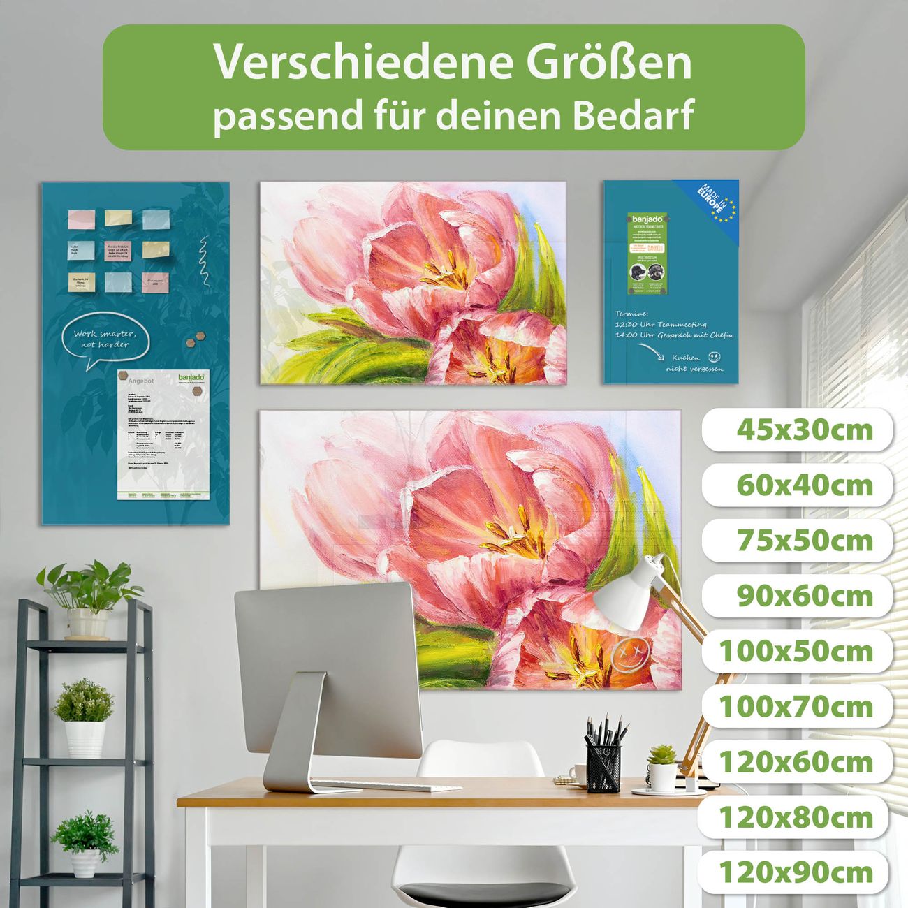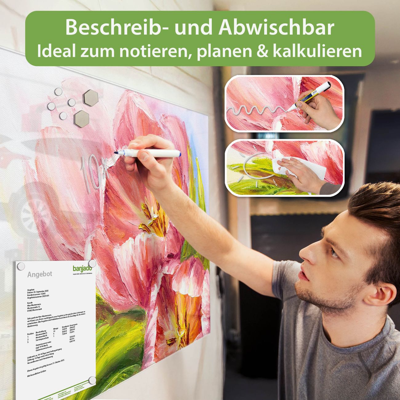 Material: 4mm Sicherheitsglas mit Metallrückwand Eigenschaften: beschreibbar, magnetisch, kratzfest Maße: 120x60x0,6cm, 10,80kg schwer Motiv Nummer 12342 Tulpen Detail Zubehör: inklusive 4 Neodym-Magnete