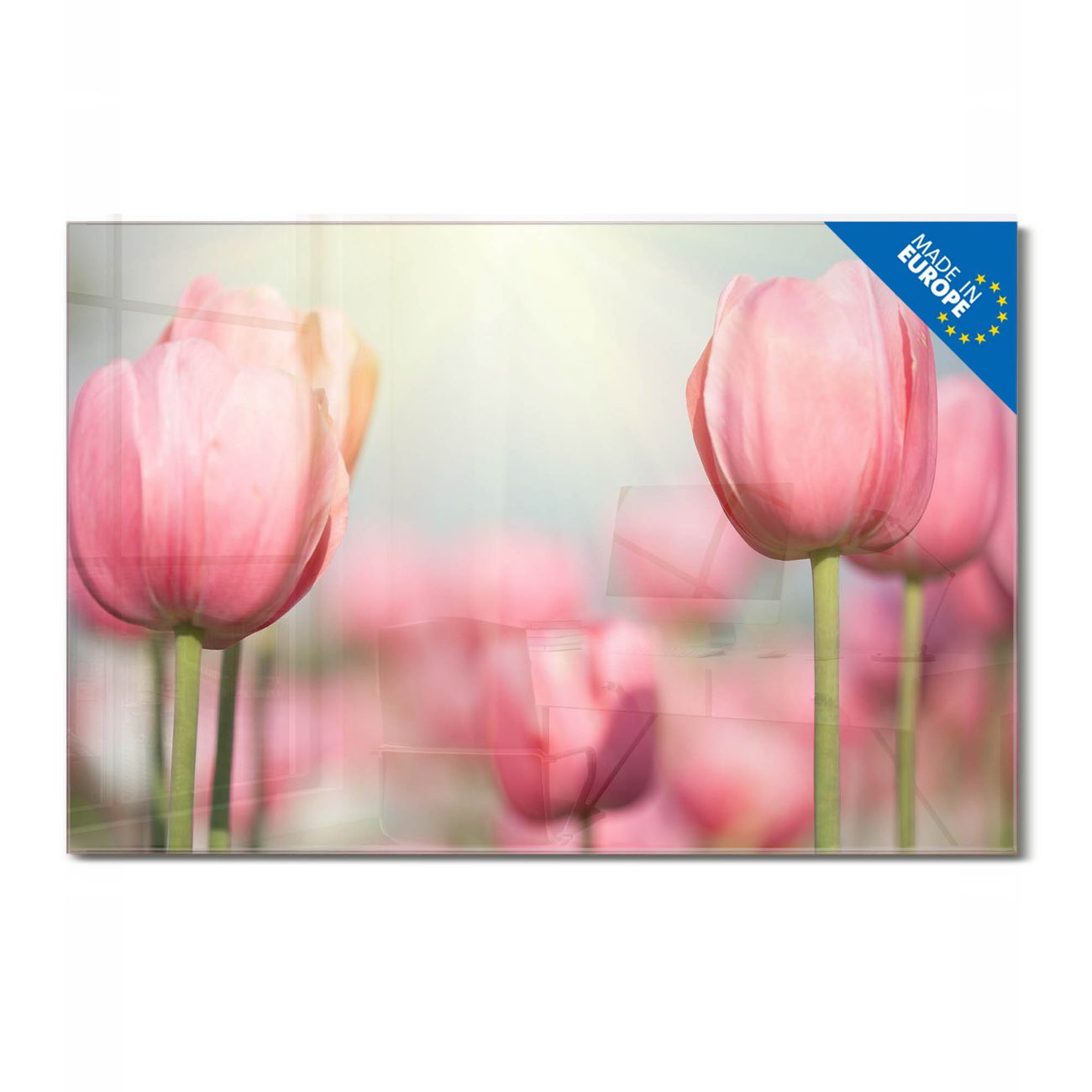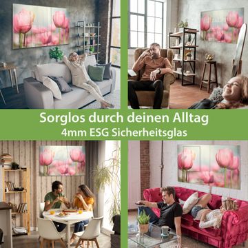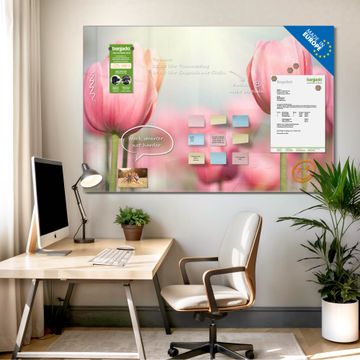 Material: 4mm Sicherheitsglas mit Metallrückwand Eigenschaften: beschreibbar, magnetisch, kratzfest Maße: 75x50x0,6cm, 5,63kg schwer Motiv Nummer 12267 Tulpen Zubehör: inklusive 4 Neodym-Magnete