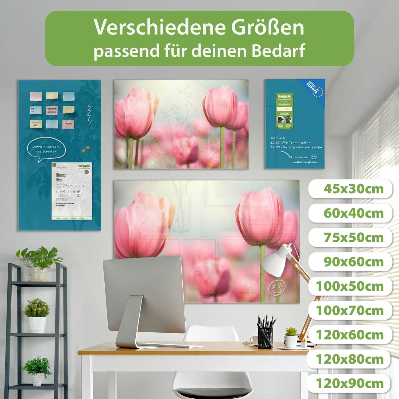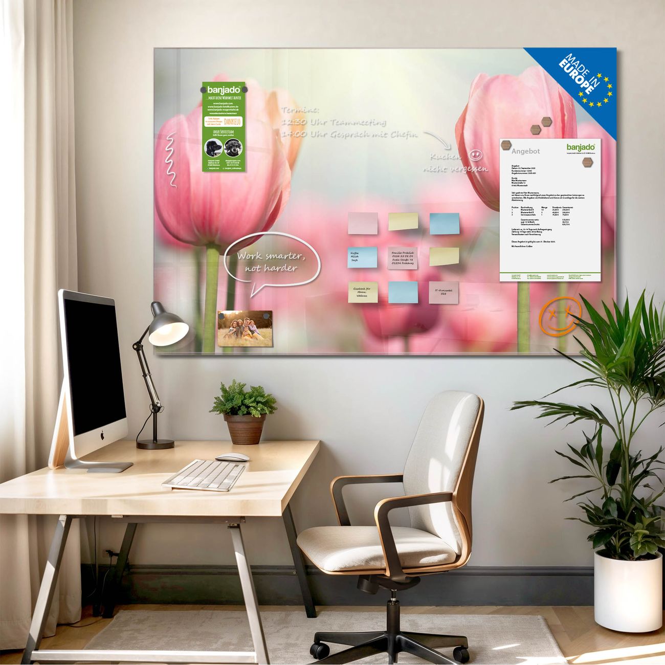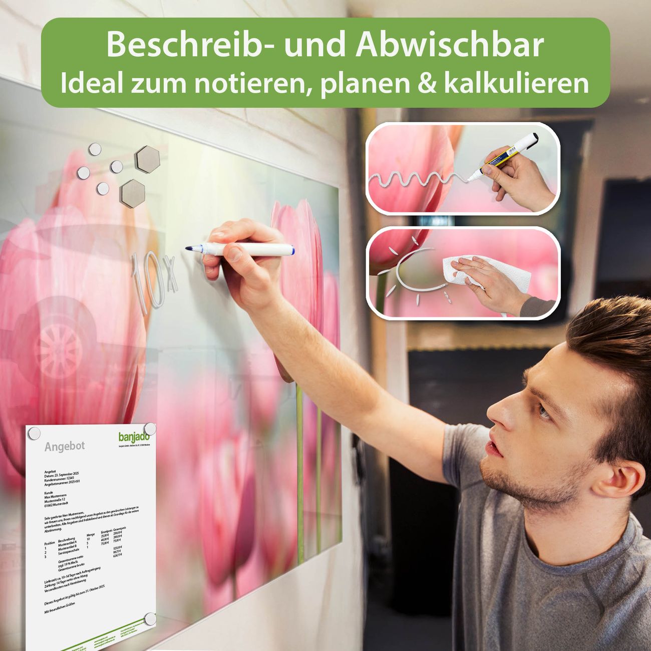 Jede Glas Magnettafel wird in unserer Werkstatt von Hand gefertigt und sorgfältig geprüft. So erhalten Sie ein echtes Qualitätsprodukt, das Funktion und Ästhetik perfekt vereint.?? Warum banjado?
