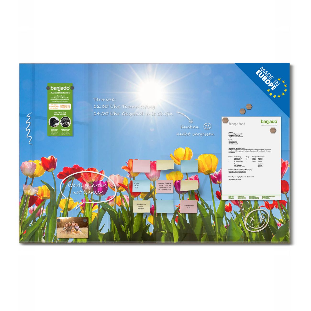 Die banjado Glas Magnettafel mit dem Motiv Motiv Tulpenmeer verbindet Funktionalität mit Stil. Sie ersetzt das Zettelchaos durch klare Strukturen und bringt dabei eine warme, natürliche Atmosphäre in Ihr Zuhause. Ob im Büro, in der Küche oder im Eingangsbereich - dieses Design-Board zieht Blicke an und sorgt für Ordnung mit Charakter.