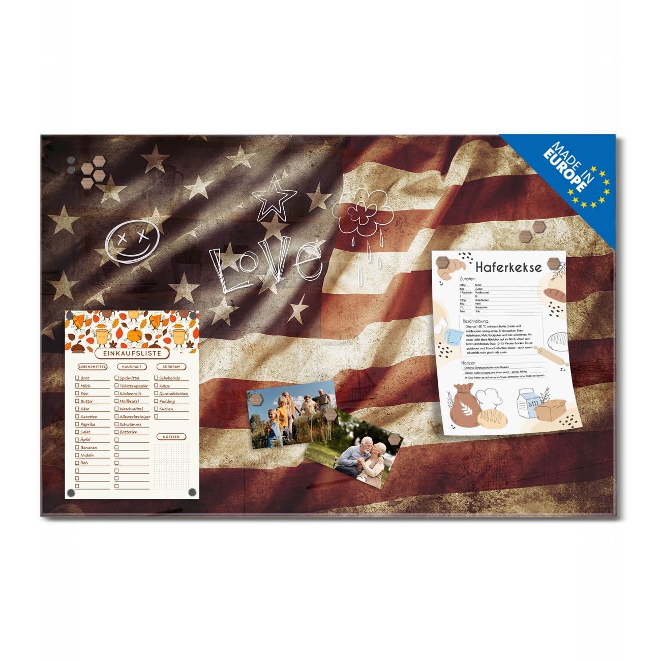 Material: 4mm Sicherheitsglas mit Metallrückwand Eigenschaften: beschreibbar, magnetisch, kratzfest Maße: 75x50x0,6cm, 5,63kg schwer Motiv Nummer 10776 United States Zubehör: inklusive 4 Neodym-Magnete