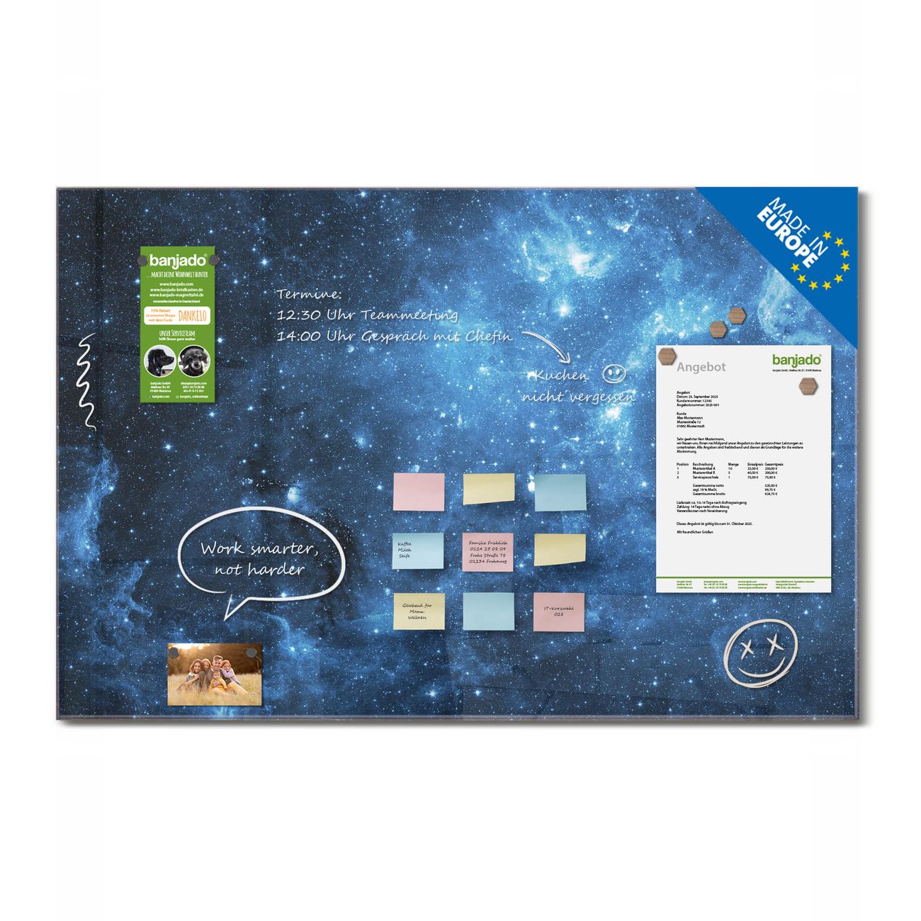 Material: 4mm Sicherheitsglas mit Metallrückwand Eigenschaften: beschreibbar, magnetisch, kratzfest Maße: 120x80x0,6cm, 14,40kg schwer Motiv Nummer 10437 Universum Zubehör: inklusive 4 Neodym-Magnete