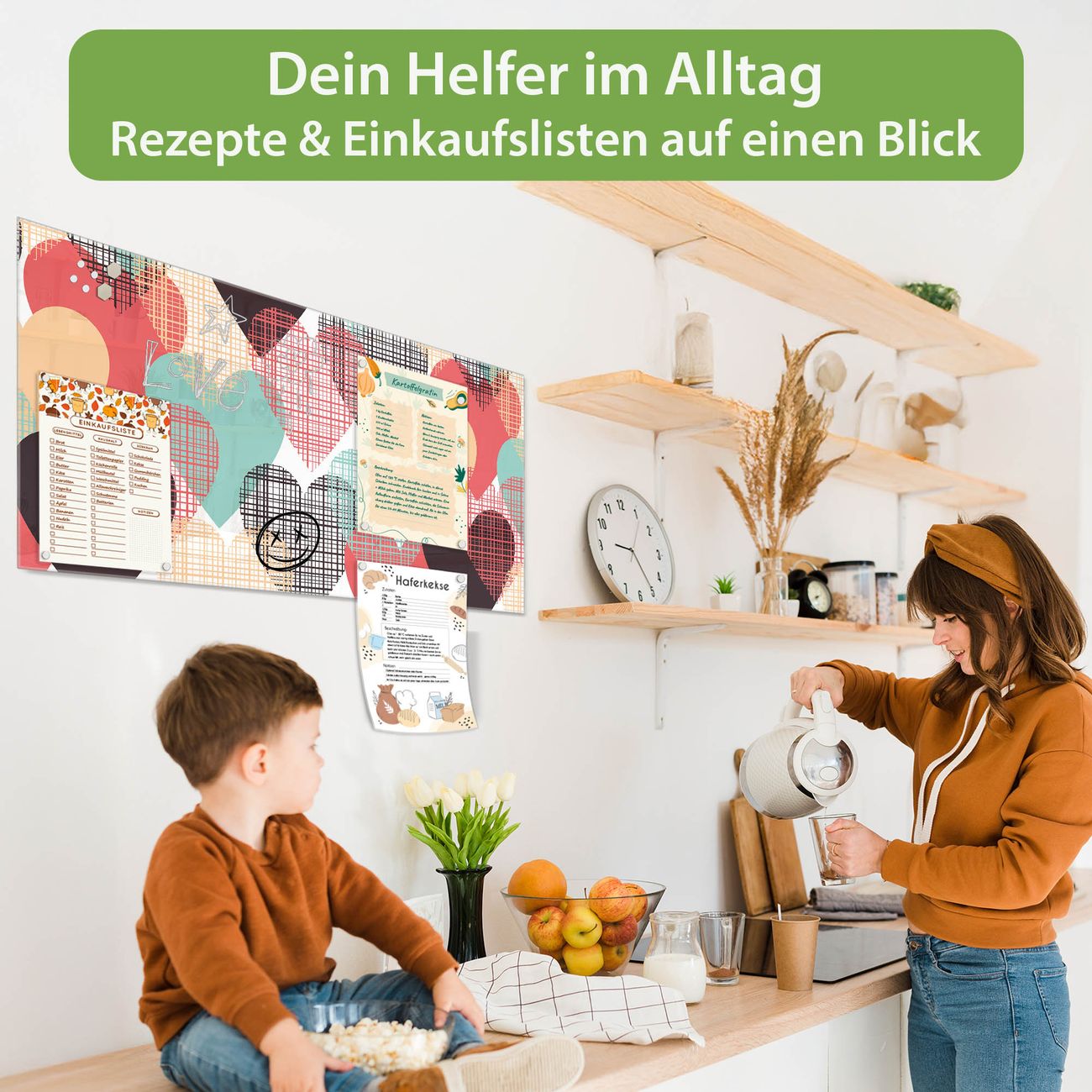 Auf der glatten Glasoberfläche lassen sich Termine, Rezepte oder Notizen ganz einfach mit Kreidestiften festhalten und rückstandslos entfernen. Starke Neodym-Magnete halten Ihre wichtigsten Erinnerungen sicher an Ort und Stelle. So entsteht Ihre ganz persönliche Ideenwand - jeden Tag neu.