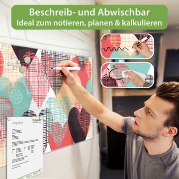 Die banjado Glas Magnettafel mit dem Motiv Motiv Unter Herzen verbindet Funktionalität mit Stil. Sie ersetzt das Zettelchaos durch klare Strukturen und bringt dabei eine warme, natürliche Atmosphäre in Ihr Zuhause. Ob im Büro, in der Küche oder im Eingangsbereich - dieses Design-Board zieht Blicke an und sorgt für Ordnung mit Charakter.