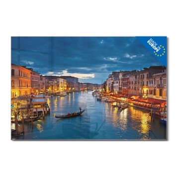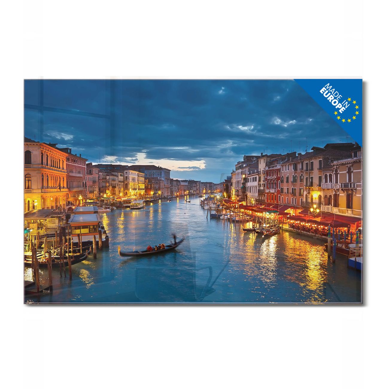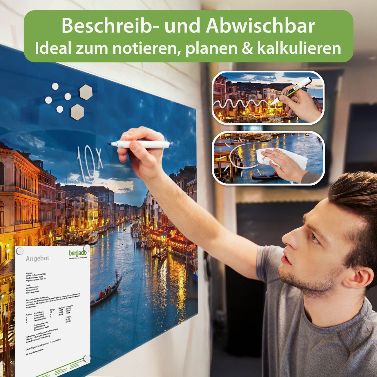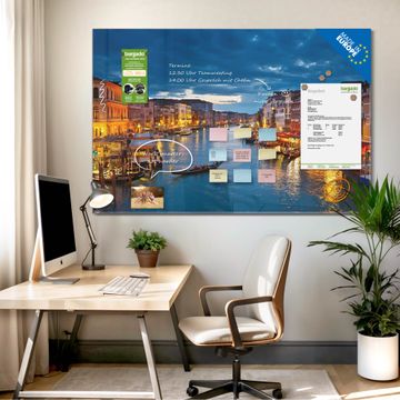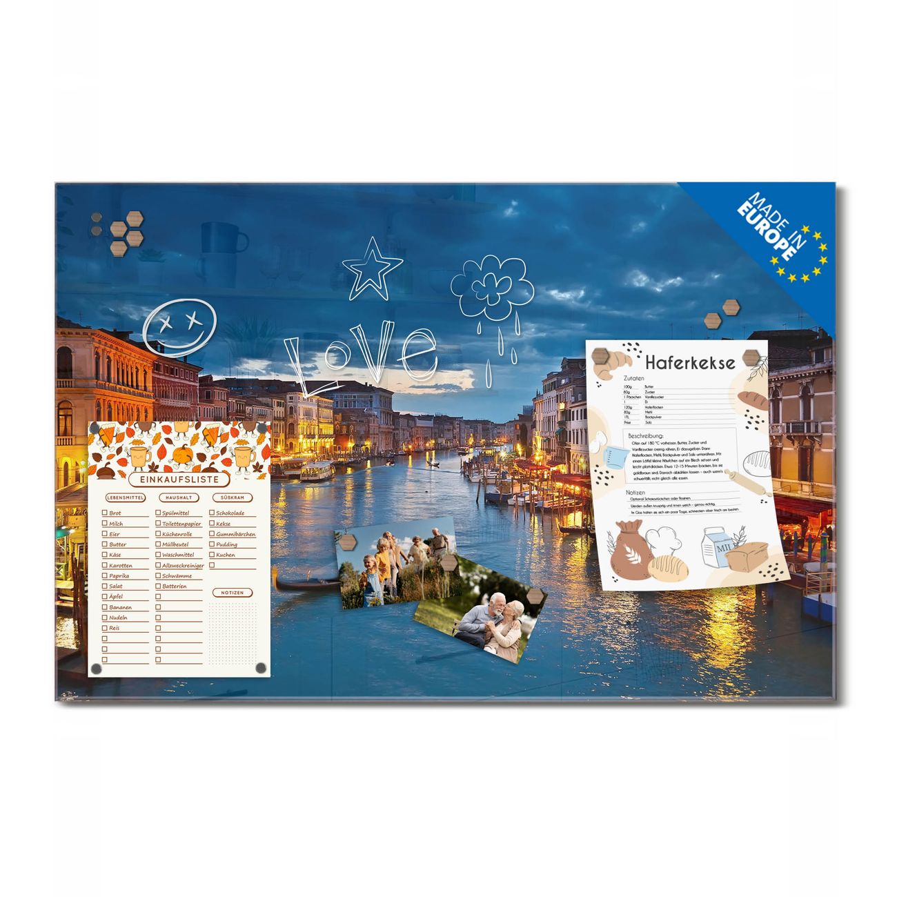 Material: 4mm Sicherheitsglas mit Metallrückwand Eigenschaften: beschreibbar, magnetisch, kratzfest Maße: 75x50x0,6cm, 5,63kg schwer Motiv Nummer 10088 Canale Grande Bei Nacht Zubehör: inklusive 4 Neodym-Magnete