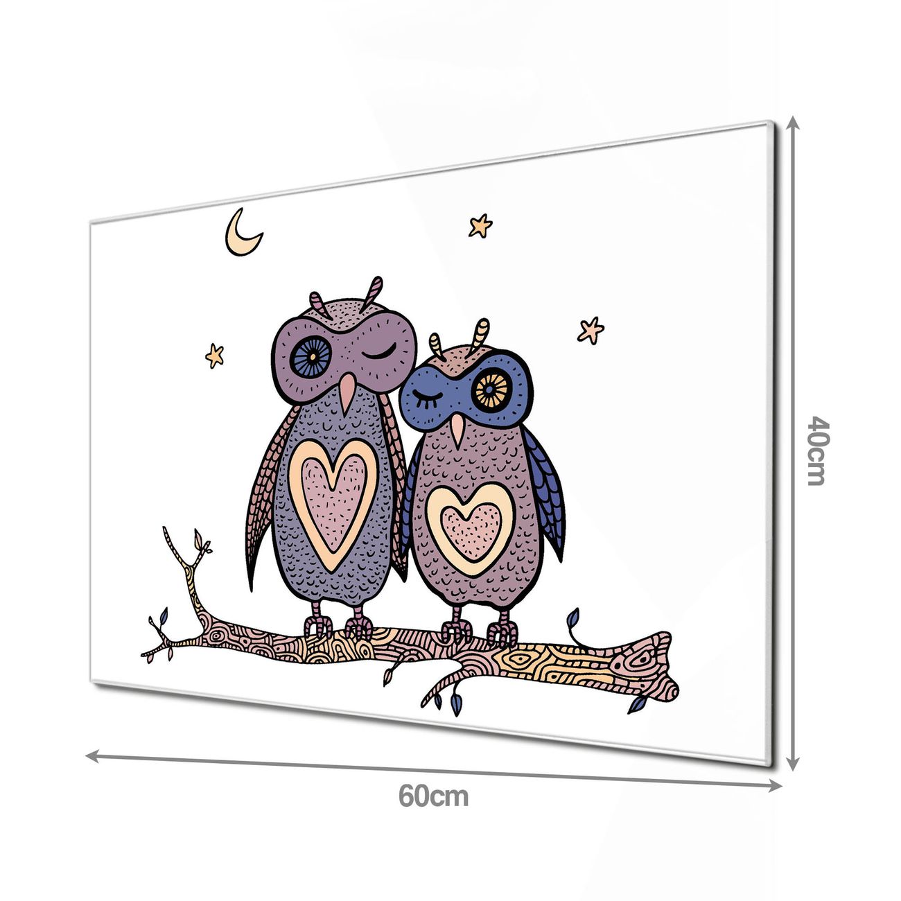 Material: 4mm Sicherheitsglas mit Metallrückwand Eigenschaften: beschreibbar, magnetisch, kratzfest Maße: 60x40x0,6cm, 3,6kg schwer Motiv Nummer 10757 Verliebte Eulen Zubehör: inklusive 4 Neodym-Magnete