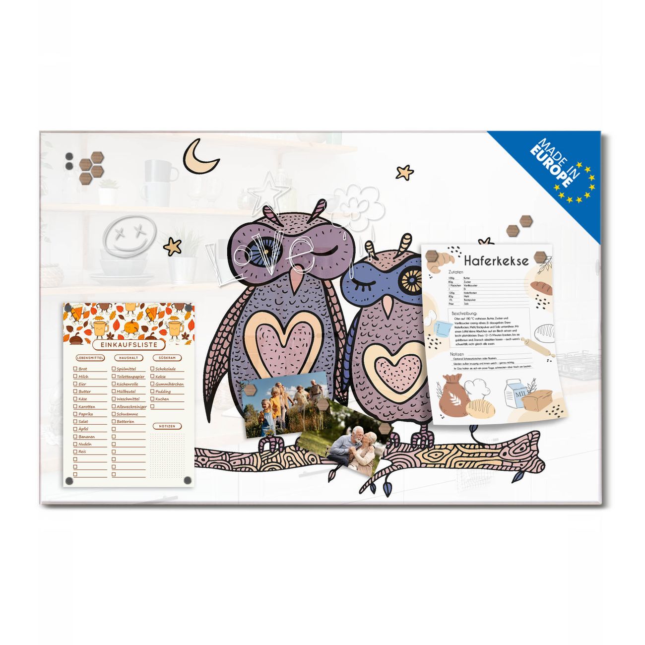 Material: 4mm Sicherheitsglas mit Metallrückwand Eigenschaften: beschreibbar, magnetisch, kratzfest Maße: 75x50x0,6cm, 5,63kg schwer Motiv Nummer 10757 Verliebte Eulen Zubehör: inklusive 4 Neodym-Magnete