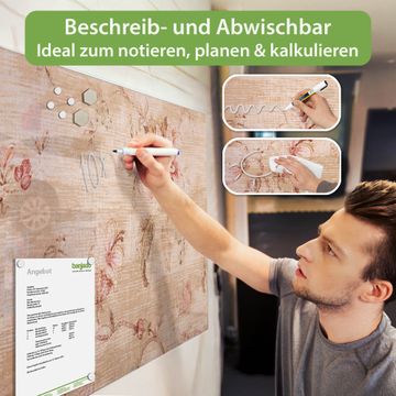 Auf der glatten Glasoberfläche lassen sich Termine, Rezepte oder Notizen ganz einfach mit Kreidestiften festhalten und rückstandslos entfernen. Starke Neodym-Magnete halten Ihre wichtigsten Erinnerungen sicher an Ort und Stelle. So entsteht Ihre ganz persönliche Ideenwand - jeden Tag neu.