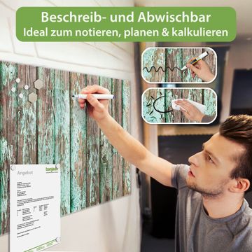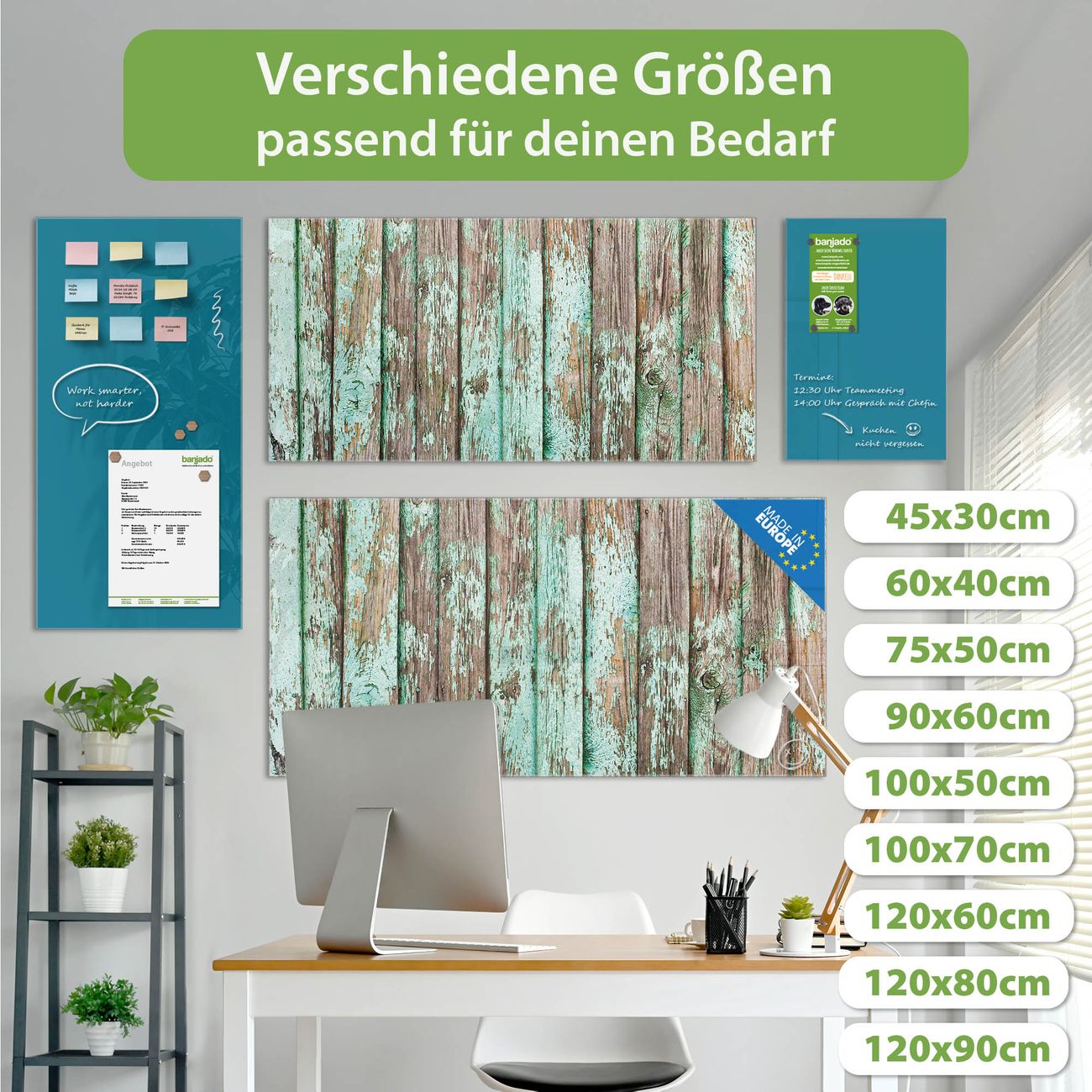Material: 4mm Sicherheitsglas mit Metallrückwand Eigenschaften: beschreibbar, magnetisch, kratzfest Maße: 100x50x0,6cm, 7,50kg schwer Motiv Nummer 12180 Verwittertes Holz Zubehör: inklusive 4 Neodym-Magnete