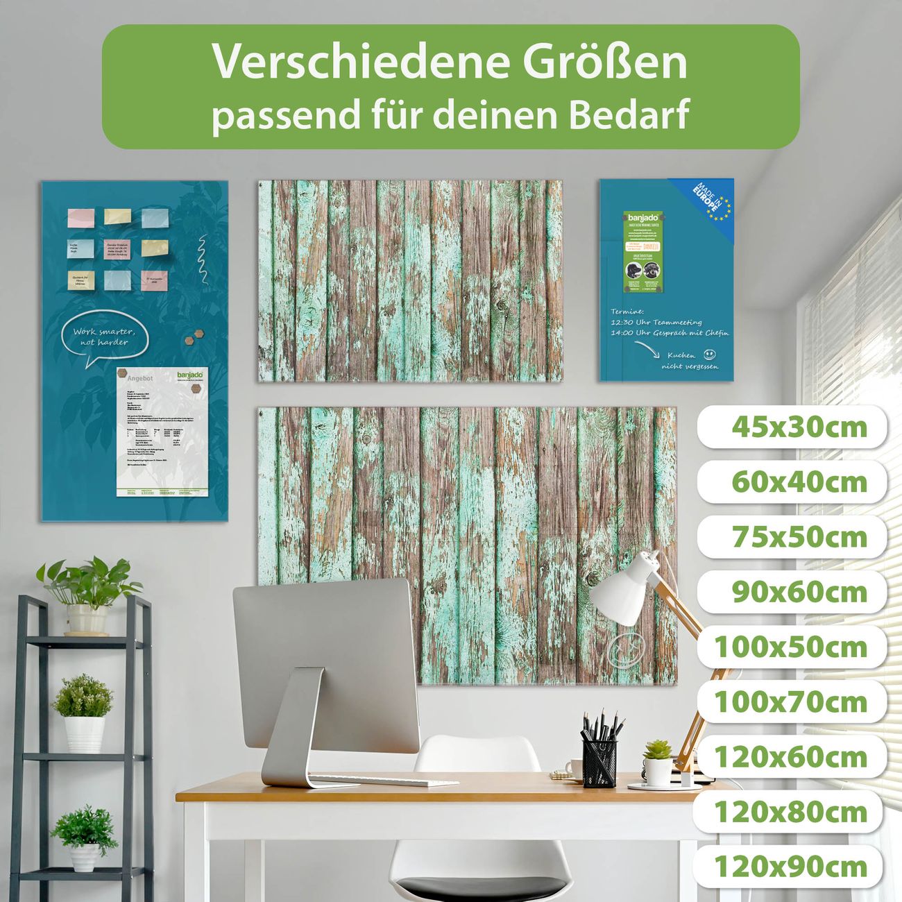 Material: 4mm Sicherheitsglas mit Metallrückwand Eigenschaften: beschreibbar, magnetisch, kratzfest Maße: 120x80x0,6cm, 14,40kg schwer Motiv Nummer 12180 Verwittertes Holz Zubehör: inklusive 4 Neodym-Magnete