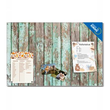 Material: 4mm Sicherheitsglas mit Metallrückwand Eigenschaften: beschreibbar, magnetisch, kratzfest Maße: 75x50x0,6cm, 5,63kg schwer Motiv Nummer 12180 Verwittertes Holz Zubehör: inklusive 4 Neodym-Magnete