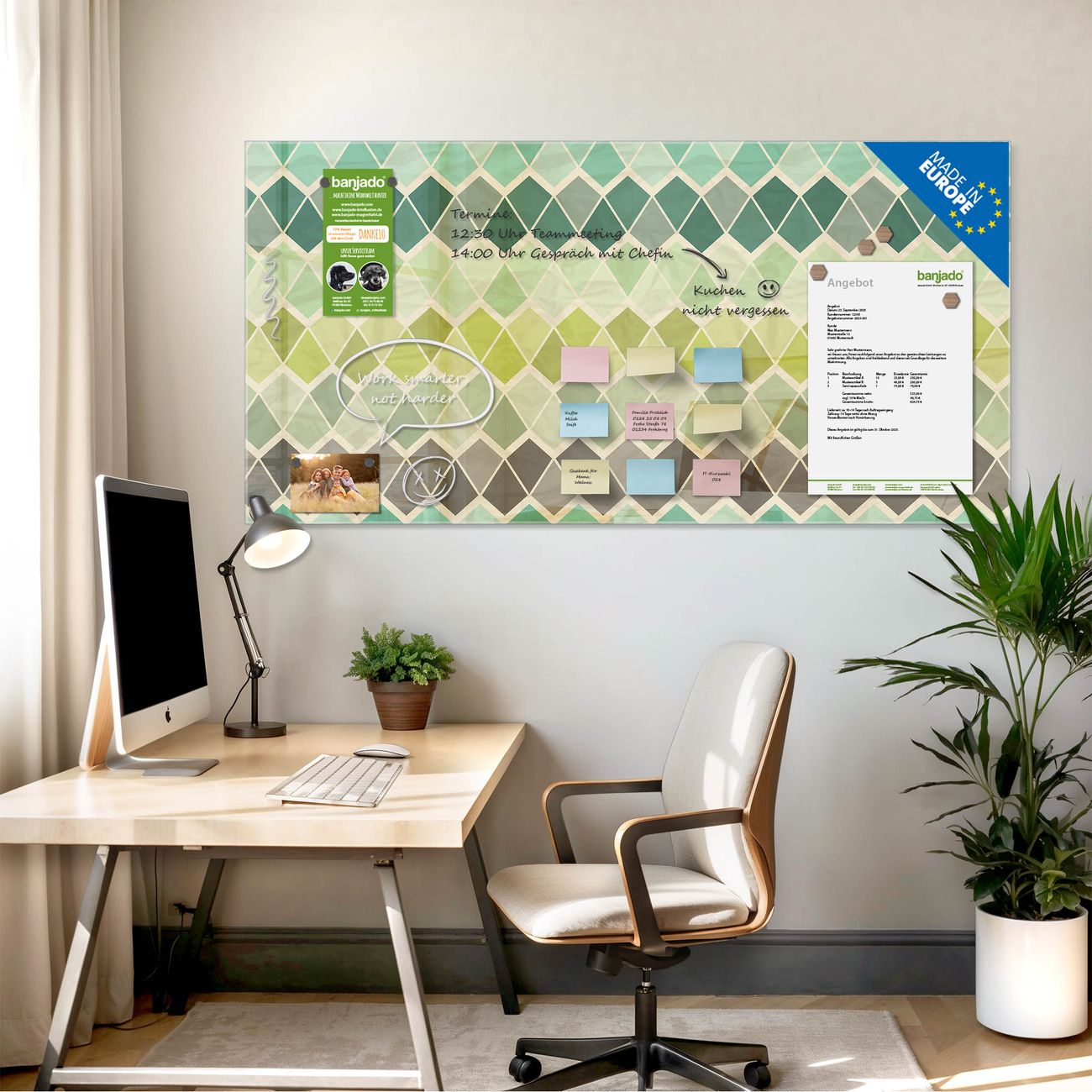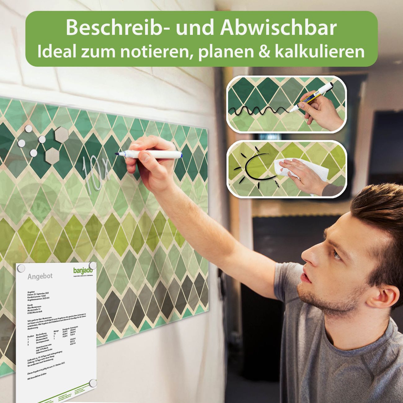 Die banjado Glas Magnettafel mit dem Motiv Motiv Vier Farben Grün verbindet Funktionalität mit Stil. Sie ersetzt das Zettelchaos durch klare Strukturen und bringt dabei eine warme, natürliche Atmosphäre in Ihr Zuhause. Ob im Büro, in der Küche oder im Eingangsbereich - dieses Design-Board zieht Blicke an und sorgt für Ordnung mit Charakter.