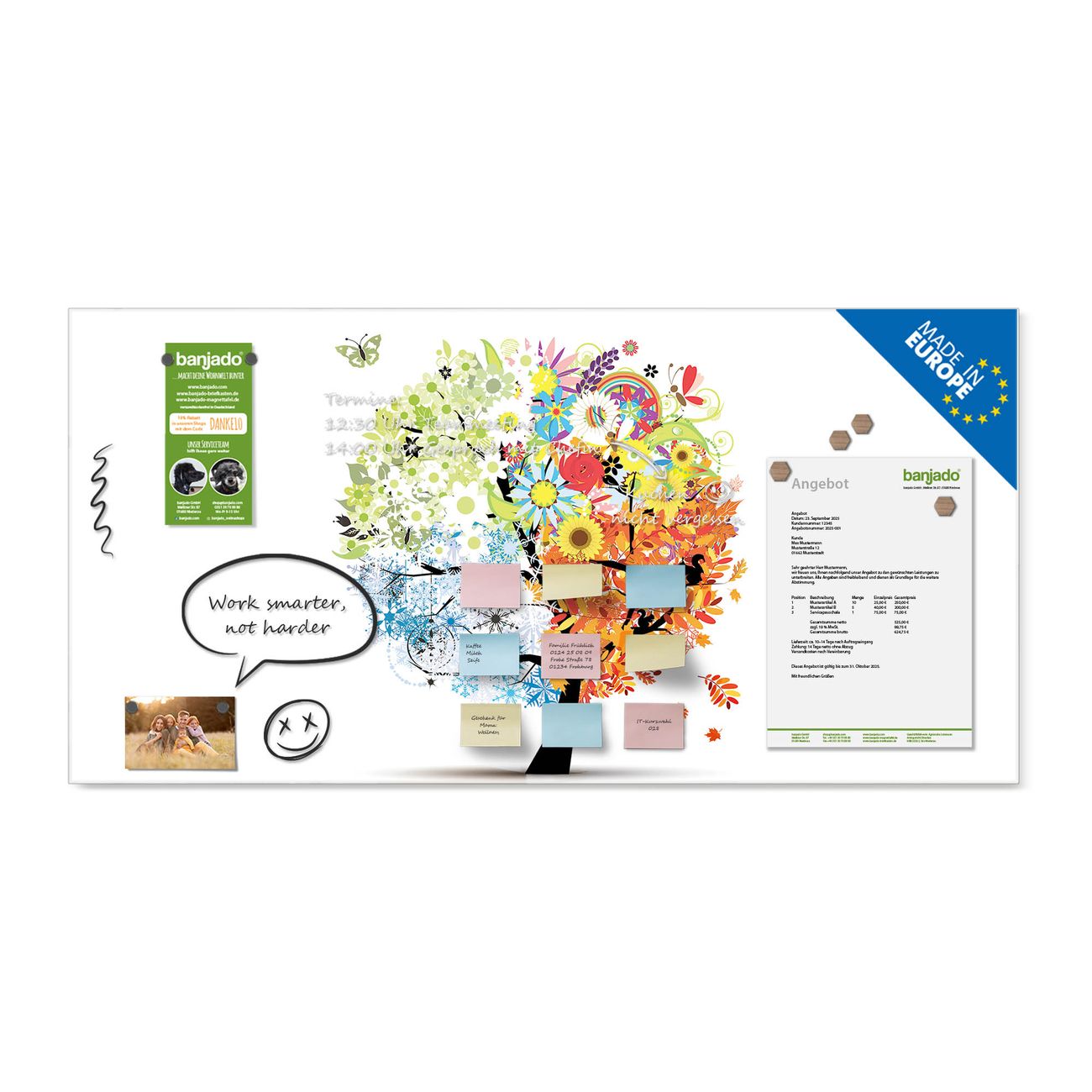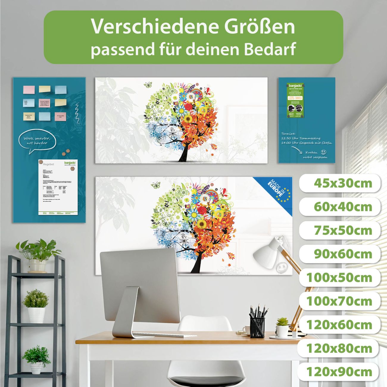 Material: 4mm Sicherheitsglas mit Metallrückwand Eigenschaften: beschreibbar, magnetisch, kratzfest Maße: 100x50x0,6cm, 7,50kg schwer Motiv Nummer 11067 Vier Jahreszeiten Zubehör: inklusive 4 Neodym-Magnete