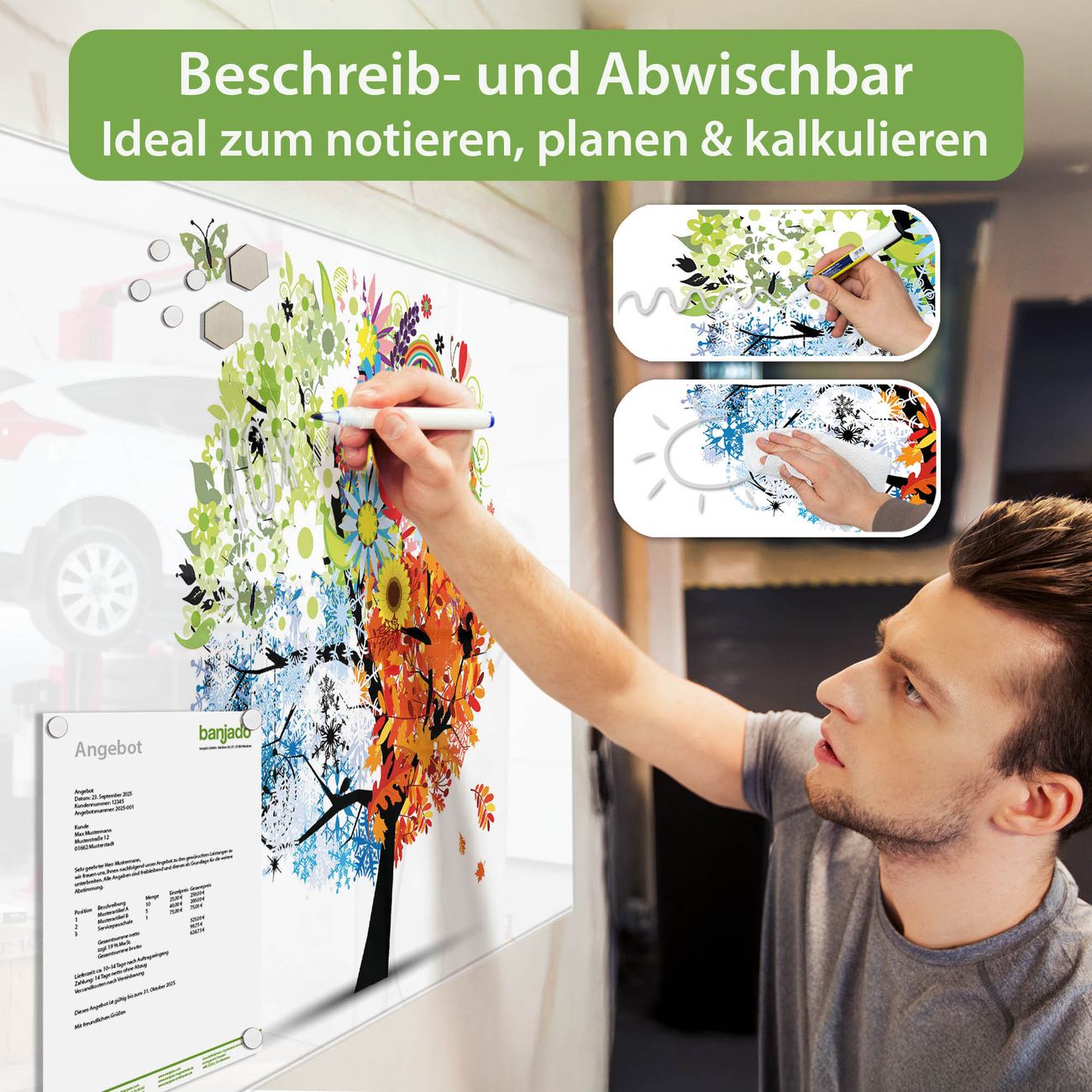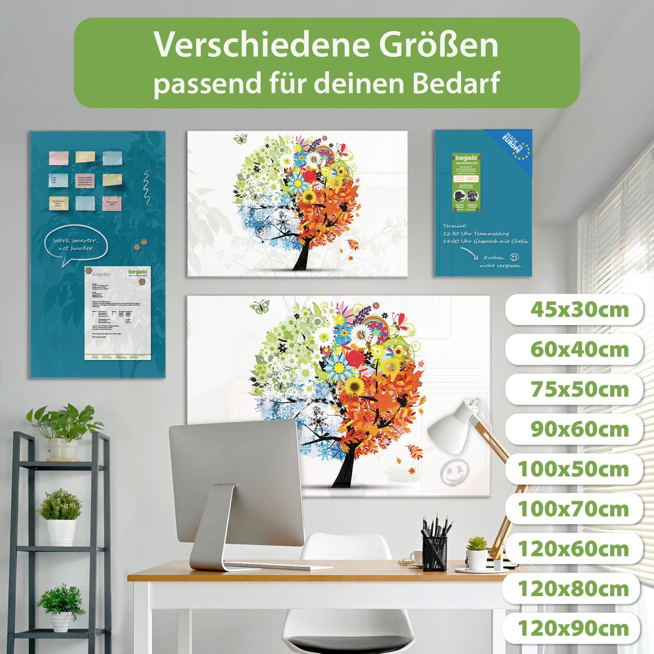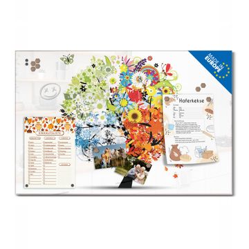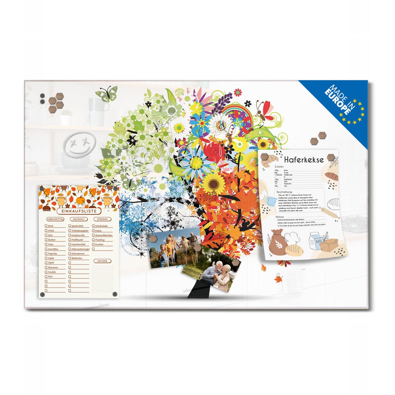 Material: 4mm Sicherheitsglas mit Metallrückwand Eigenschaften: beschreibbar, magnetisch, kratzfest Maße: 75x50x0,6cm, 5,63kg schwer Motiv Nummer 11067 Vier Jahreszeiten Zubehör: inklusive 4 Neodym-Magnete
