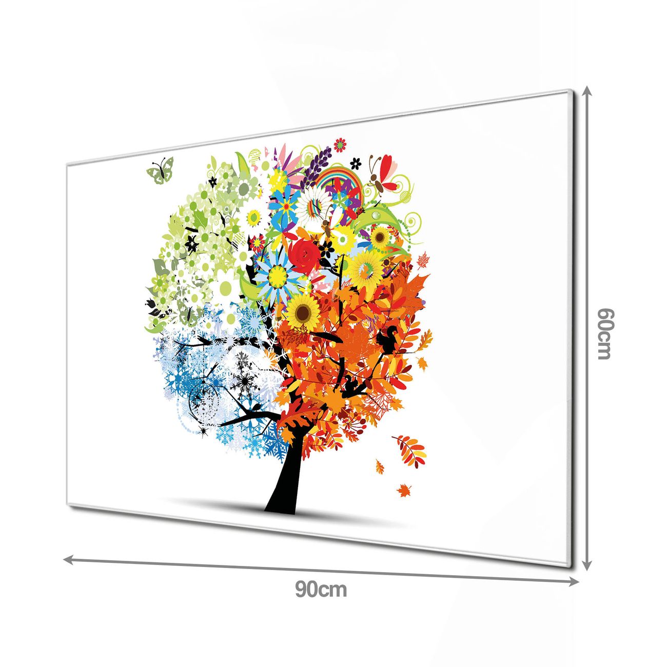 Material: 4mm Sicherheitsglas mit Metallrückwand Eigenschaften: beschreibbar, magnetisch, kratzfest Maße: 90x60x0,6cm, 8,10kg schwer Motiv Nummer 11067 Vier Jahreszeiten Zubehör: inklusive 4 Neodym-Magnete