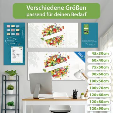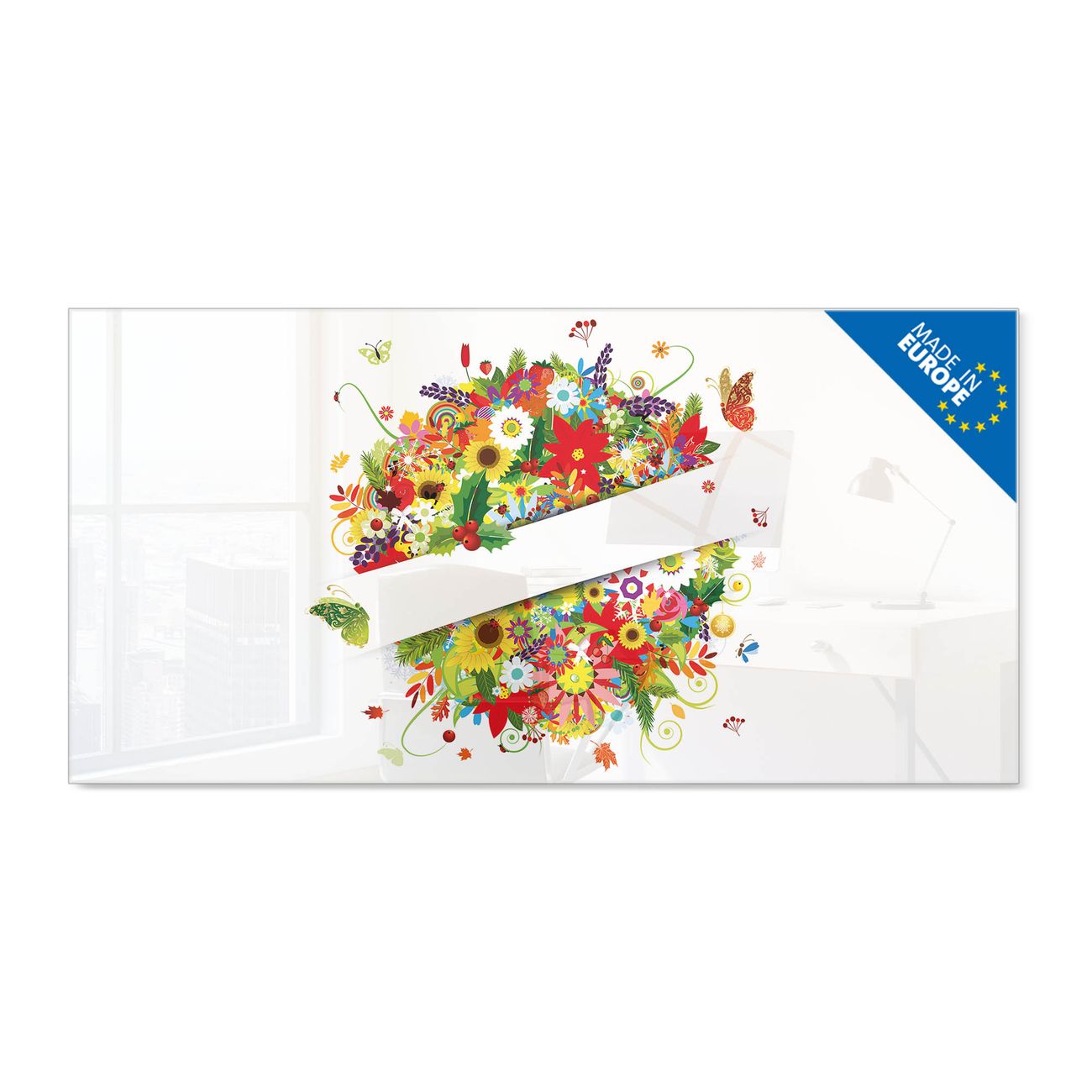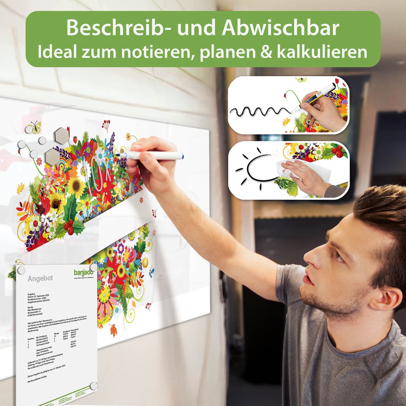 Material: 4mm Sicherheitsglas mit Metallrückwand Eigenschaften: beschreibbar, magnetisch, kratzfest Maße: 100x50x0,6cm, 7,50kg schwer Motiv Nummer 10378 Sommer Zubehör: inklusive 4 Neodym-Magnete