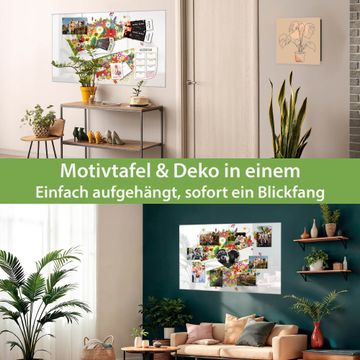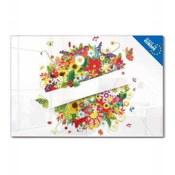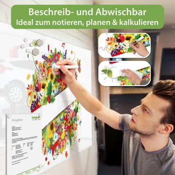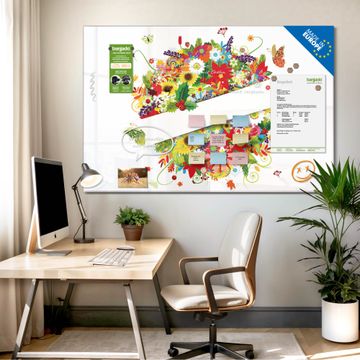 Material: 4mm Sicherheitsglas mit Metallrückwand Eigenschaften: beschreibbar, magnetisch, kratzfest Maße: 120x80x0,6cm, 14,40kg schwer Motiv Nummer 10378 Sommer Zubehör: inklusive 4 Neodym-Magnete