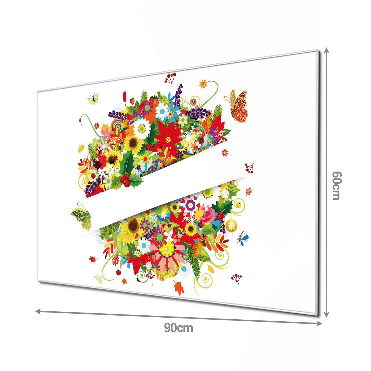 Material: 4mm Sicherheitsglas mit Metallrückwand Eigenschaften: beschreibbar, magnetisch, kratzfest Maße: 90x60x0,6cm, 8,10kg schwer Motiv Nummer 10378 Sommer Zubehör: inklusive 4 Neodym-Magnete