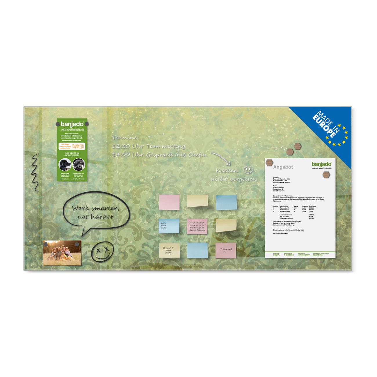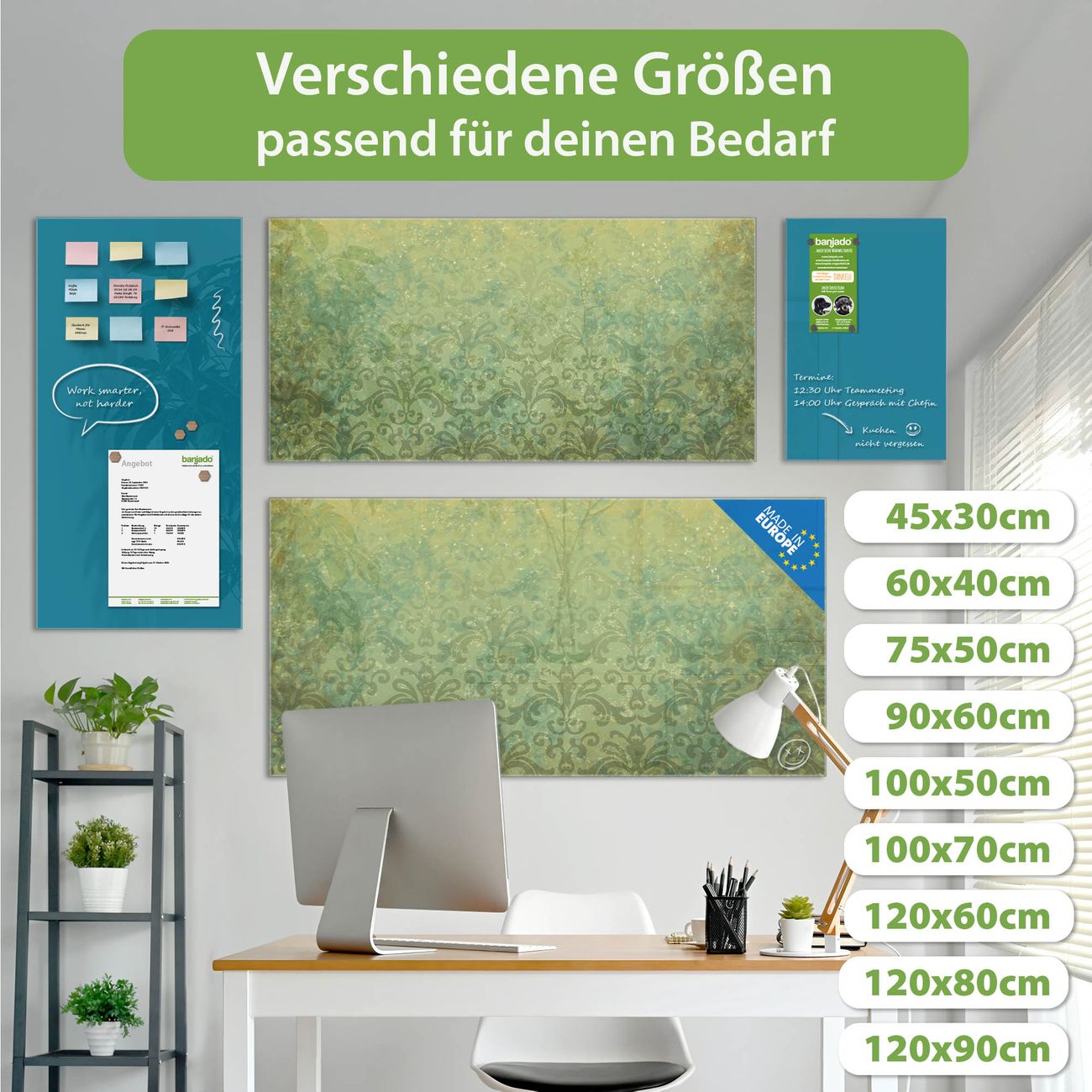 Material: 4mm Sicherheitsglas mit Metallrückwand Eigenschaften: beschreibbar, magnetisch, kratzfest Maße: 100x50x0,6cm, 7,50kg schwer Motiv Nummer 10927 Vintage Messing Zubehör: inklusive 4 Neodym-Magnete