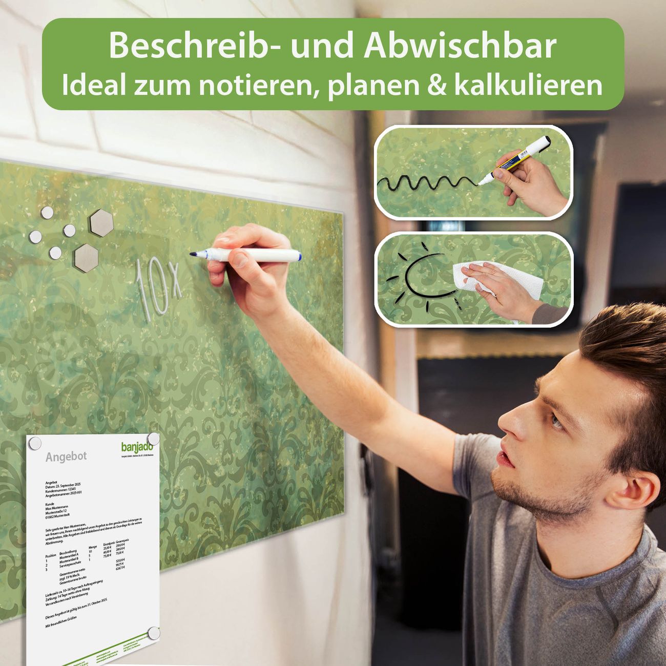Auf der glatten Glasoberfläche lassen sich Termine, Rezepte oder Notizen ganz einfach mit Kreidestiften festhalten und rückstandslos entfernen. Starke Neodym-Magnete halten Ihre wichtigsten Erinnerungen sicher an Ort und Stelle. So entsteht Ihre ganz persönliche Ideenwand - jeden Tag neu.