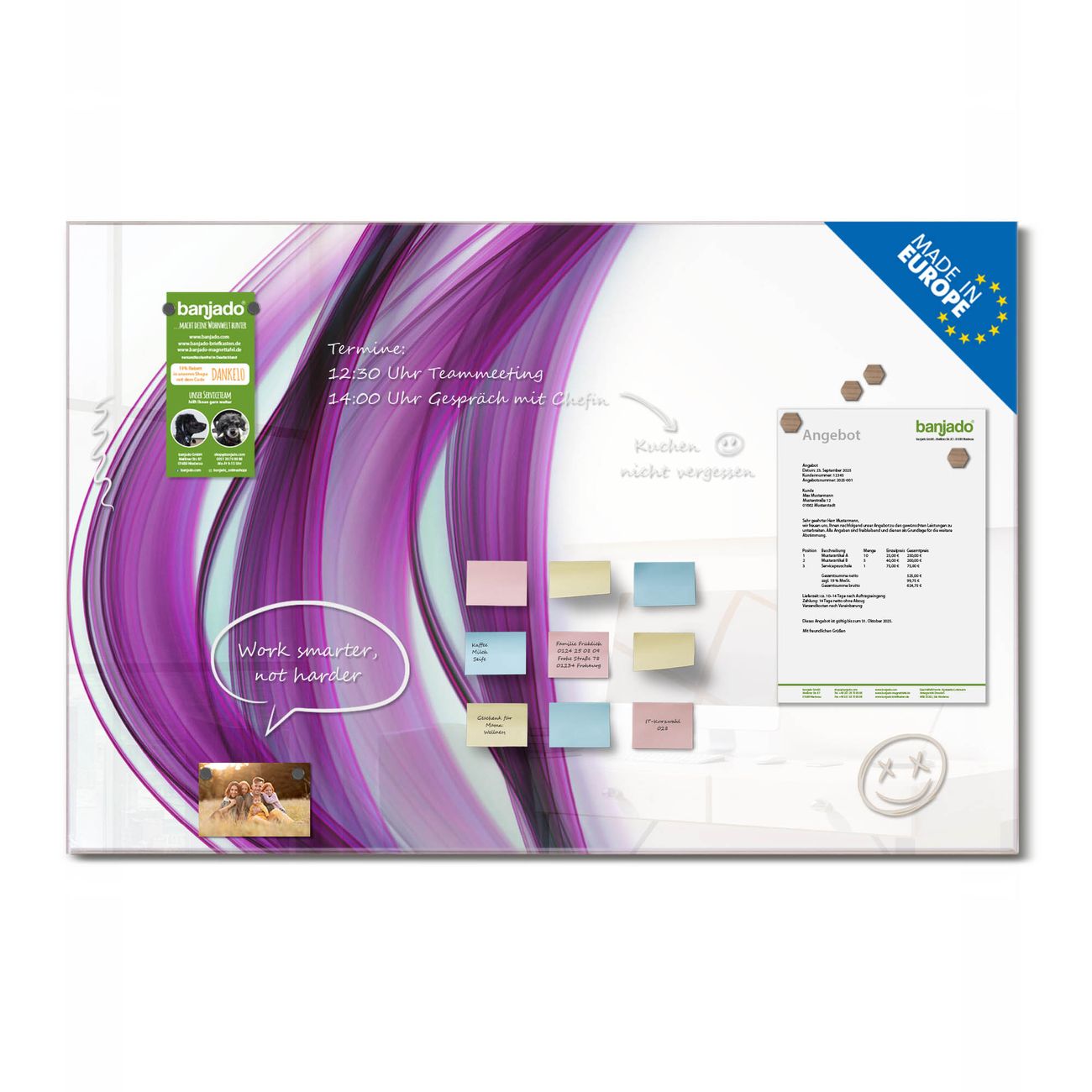 Jede Glas Magnettafel wird in unserer Werkstatt von Hand gefertigt und sorgfältig geprüft. So erhalten Sie ein echtes Qualitätsprodukt, das Funktion und Ästhetik perfekt vereint.?? Warum banjado?
