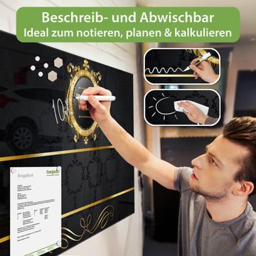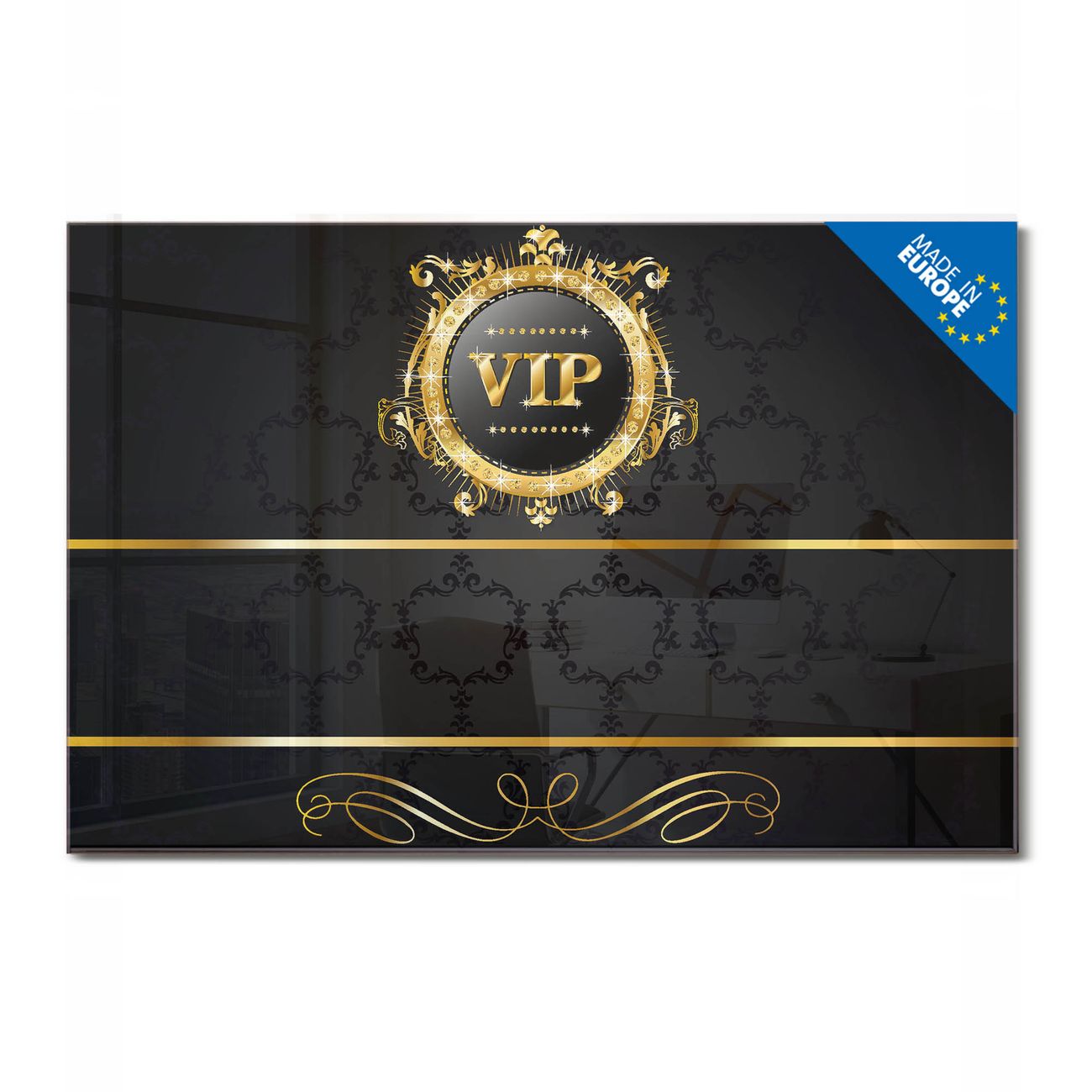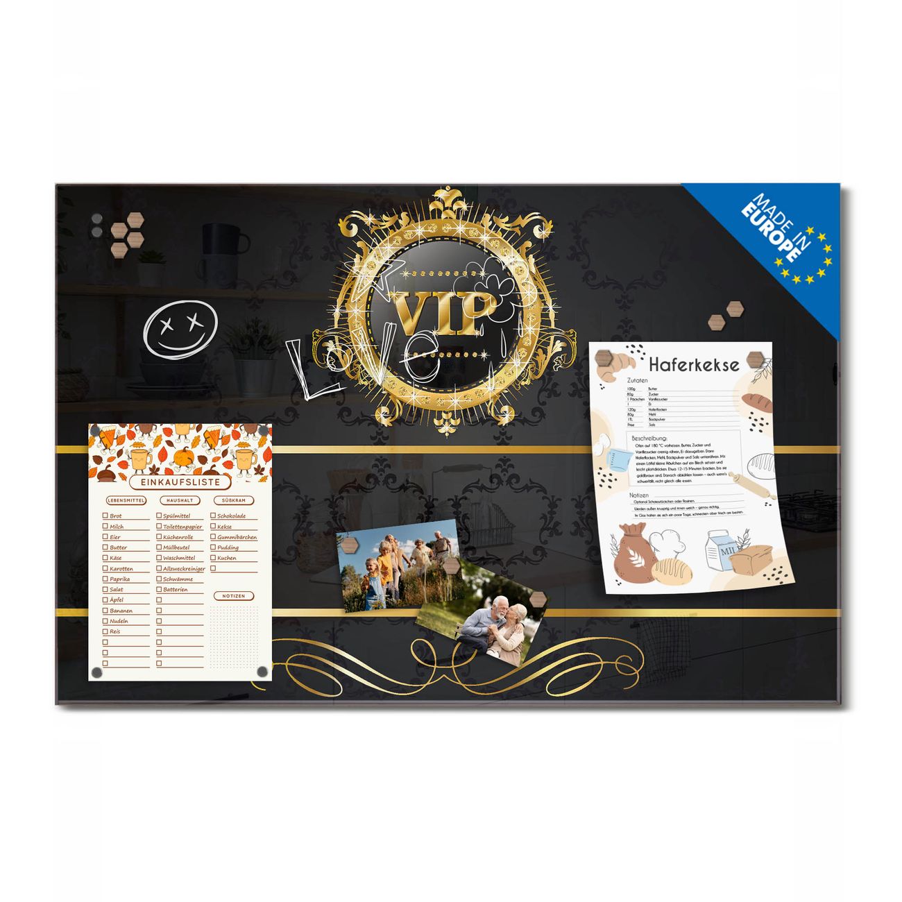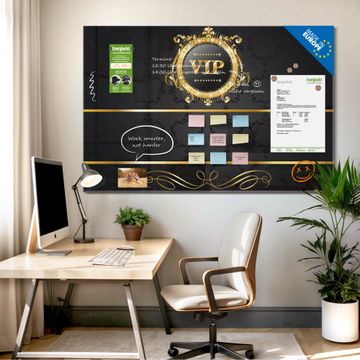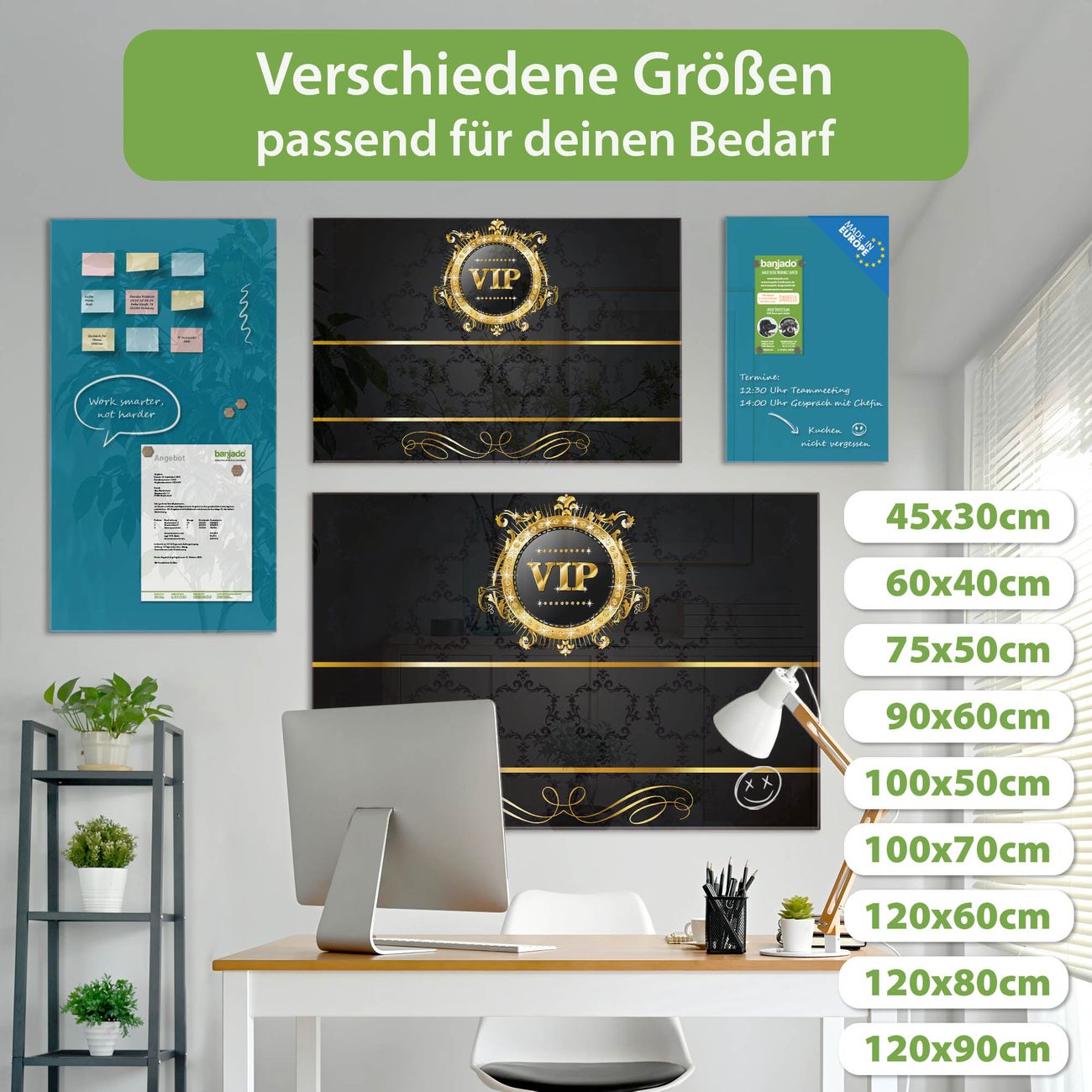 Material: 4mm Sicherheitsglas mit Metallrückwand Eigenschaften: beschreibbar, magnetisch, kratzfest Maße: 75x50x0,6cm, 5,63kg schwer Motiv Nummer 10216 VIP Zubehör: inklusive 4 Neodym-Magnete