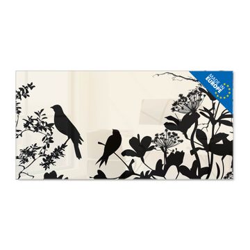 Material: 4mm Sicherheitsglas mit Metallrückwand Eigenschaften: beschreibbar, magnetisch, kratzfest Maße: 100x50x0,6cm, 7,50kg schwer Motiv Nummer 12070 Vögel Schattenriß Zubehör: inklusive 4 Neodym-Magnete