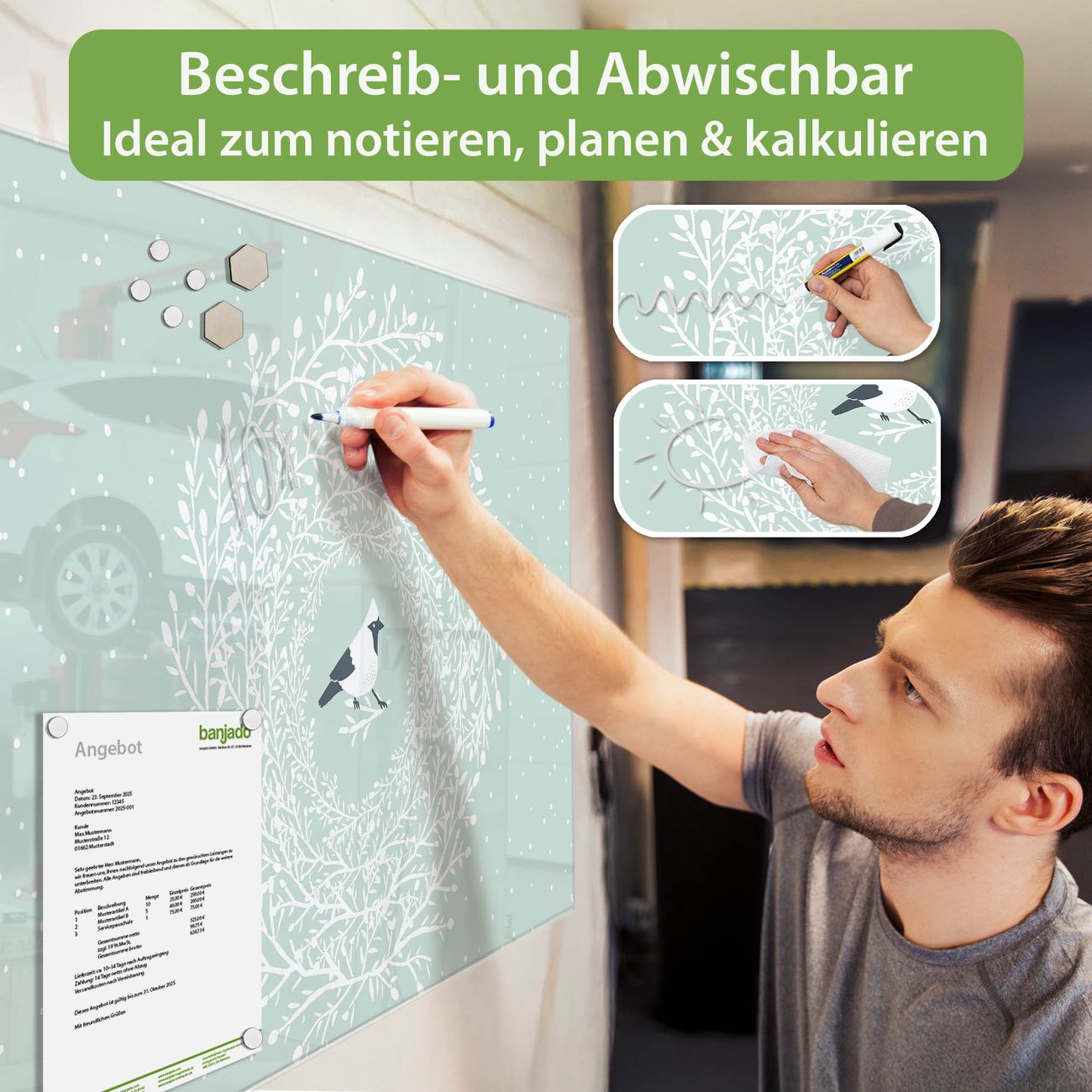 Material: 4mm Sicherheitsglas mit Metallrückwand Eigenschaften: beschreibbar, magnetisch, kratzfest Maße: 45x30x0,6cm, 2,03kg schwer Motiv Nummer 12647 Vogel im Kranz Zubehör: inklusive 4 Neodym-Magnete