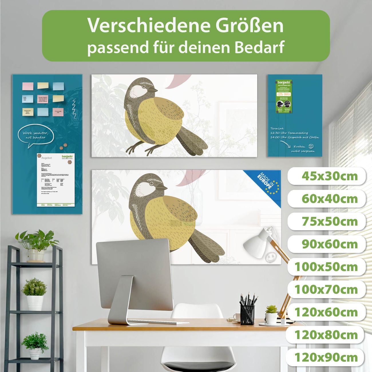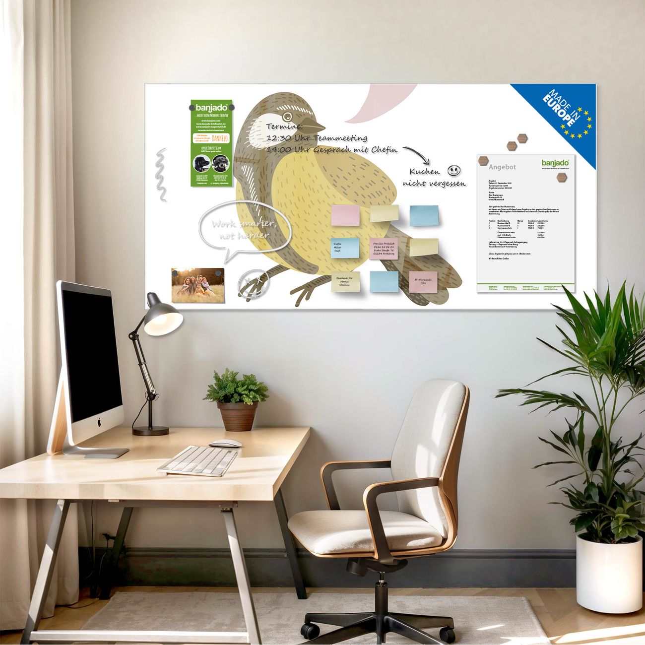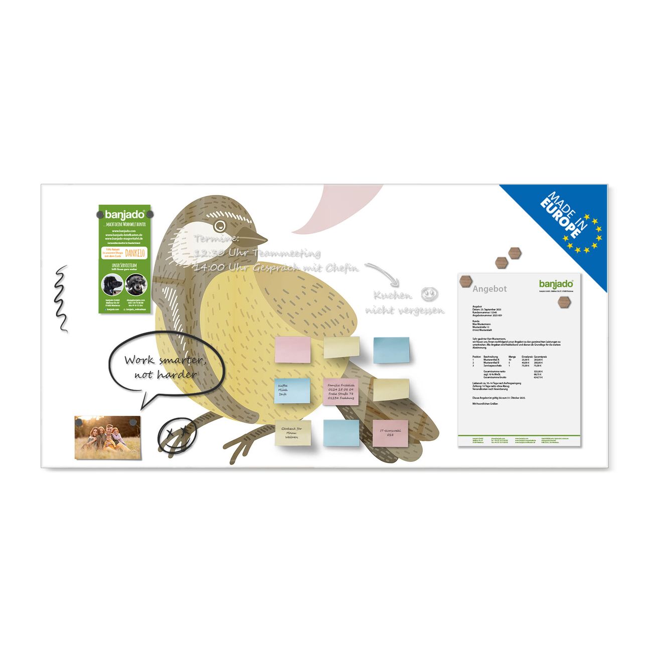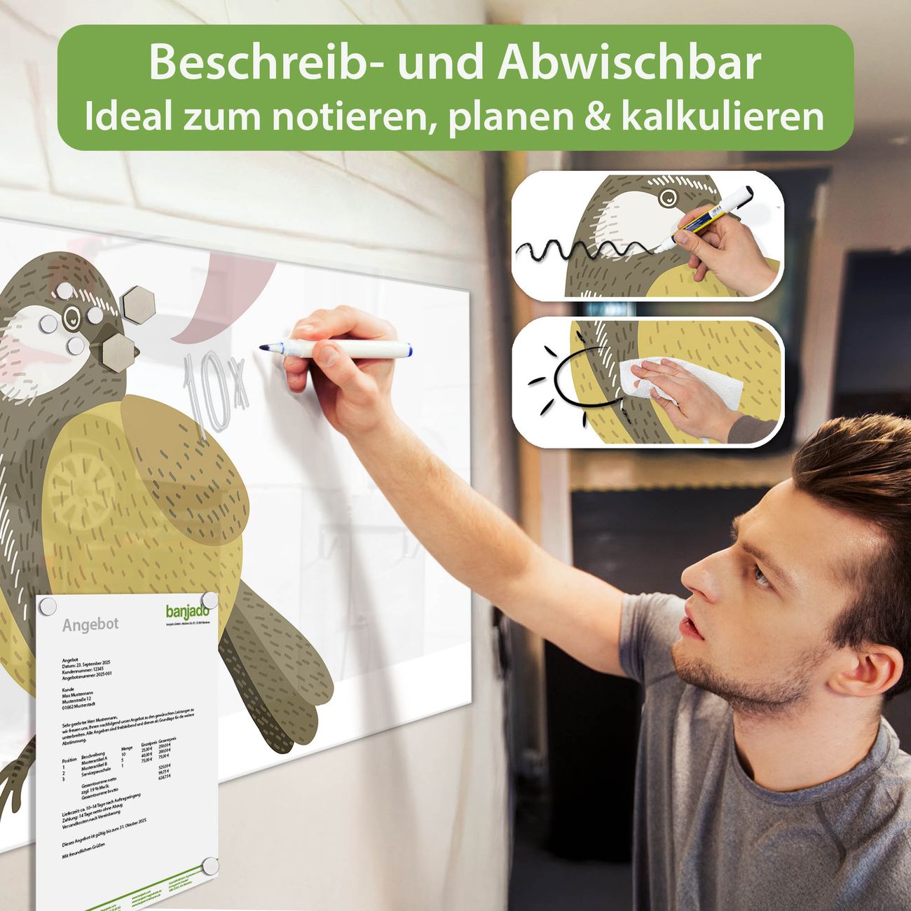 Jede Glas Magnettafel wird in unserer Werkstatt von Hand gefertigt und sorgfältig geprüft. So erhalten Sie ein echtes Qualitätsprodukt, das Funktion und Ästhetik perfekt vereint.?? Warum banjado?